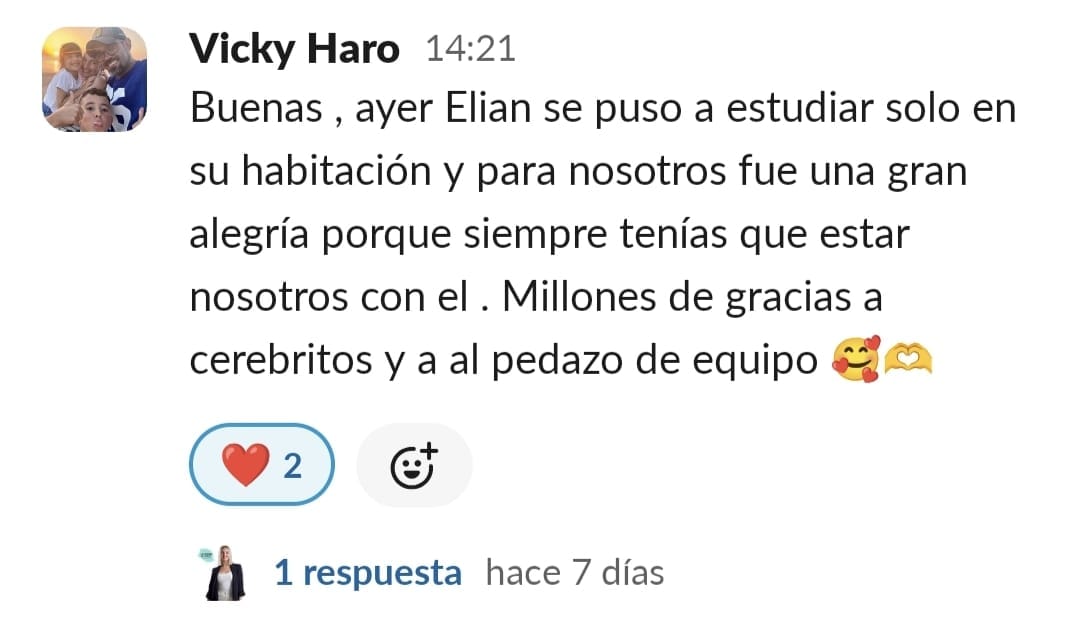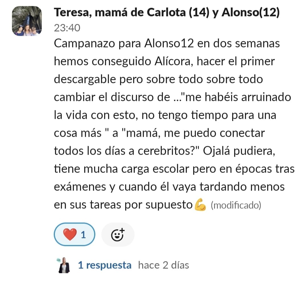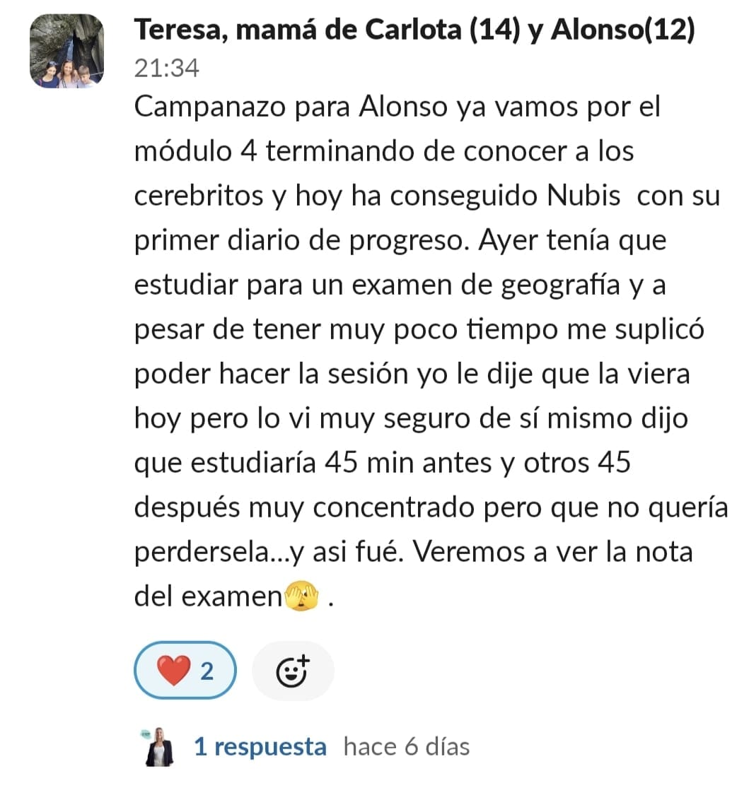 Al entrar en Cerebritos creía que solamente le serviría para aprender técnicas de estudio y poco más. Una vez dentro descubres que además de las técnicas de estudio nada aburridas, encuentran motivación, ayudan a que el momento deberes y estudio lo cojan con ganas, apoyo familiar, nos han abierto los ojos tanto a los niños como a los padres de cara a como saber llevar esta situación lo que conlleva a un mejor ambiente en casa, organización y cuando crees que ya lo tienes todo Paula te sorprende con algo nuevo que siempre es para hacer click, pensar y mejorar. En definitiva, que entras por la mejora de tus hijos y no sólo mejoran ellos sino que tu cabeza también hace click y ves todo de distinta manera, empatizas más, tienes más paciencia y controlas mejor la situación.