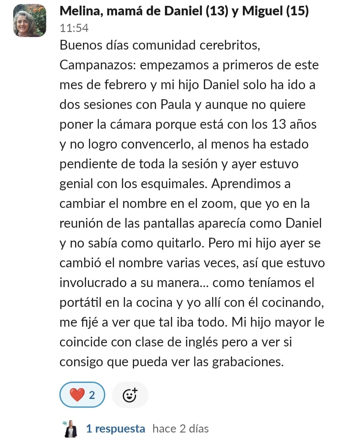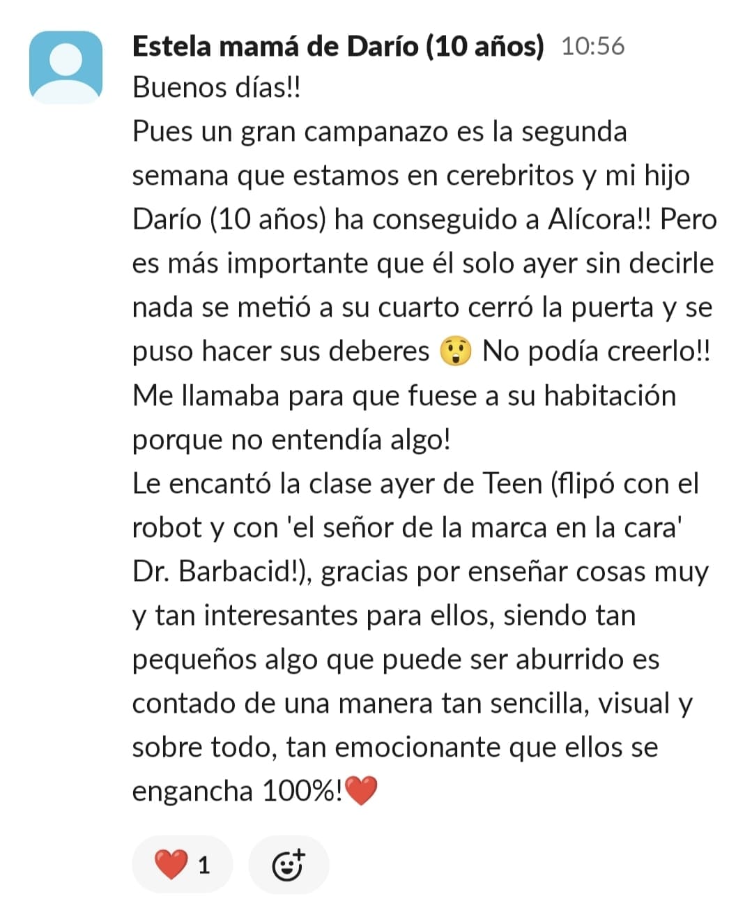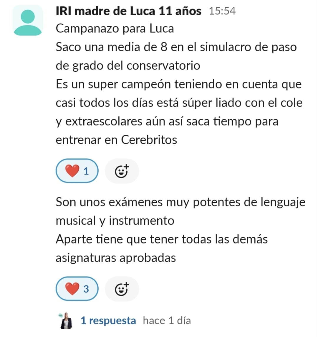 Al entrar en Cerebritos creía que solamente le serviría para aprender técnicas de estudio y poco más. Una vez dentro descubres que además de las técnicas de estudio nada aburridas, encuentran motivación, ayudan a que el momento deberes y estudio lo cojan con ganas, apoyo familiar, nos han abierto los ojos tanto a los niños como a los padres de cara a como saber llevar esta situación lo que conlleva a un mejor ambiente en casa, organización y cuando crees que ya lo tienes todo Paula te sorprende con algo nuevo que siempre es para hacer click, pensar y mejorar. En definitiva, que entras por la mejora de tus hijos y no sólo mejoran ellos sino que tu cabeza también hace click y ves todo de distinta manera, empatizas más, tienes más paciencia y controlas mejor la situación.