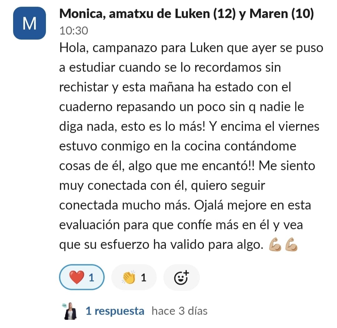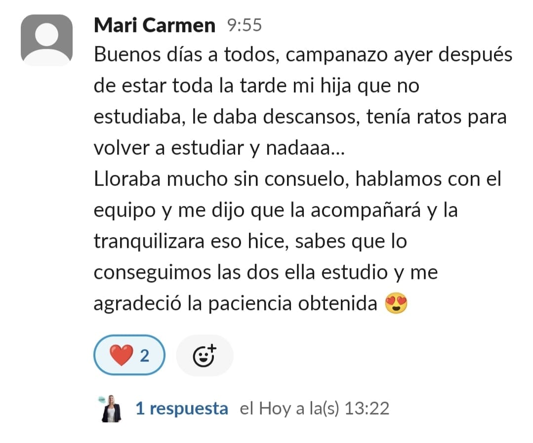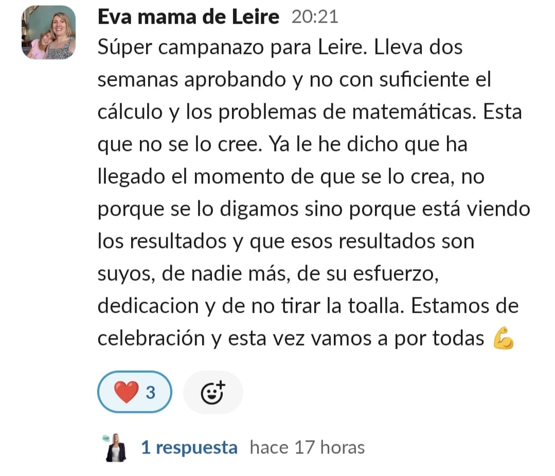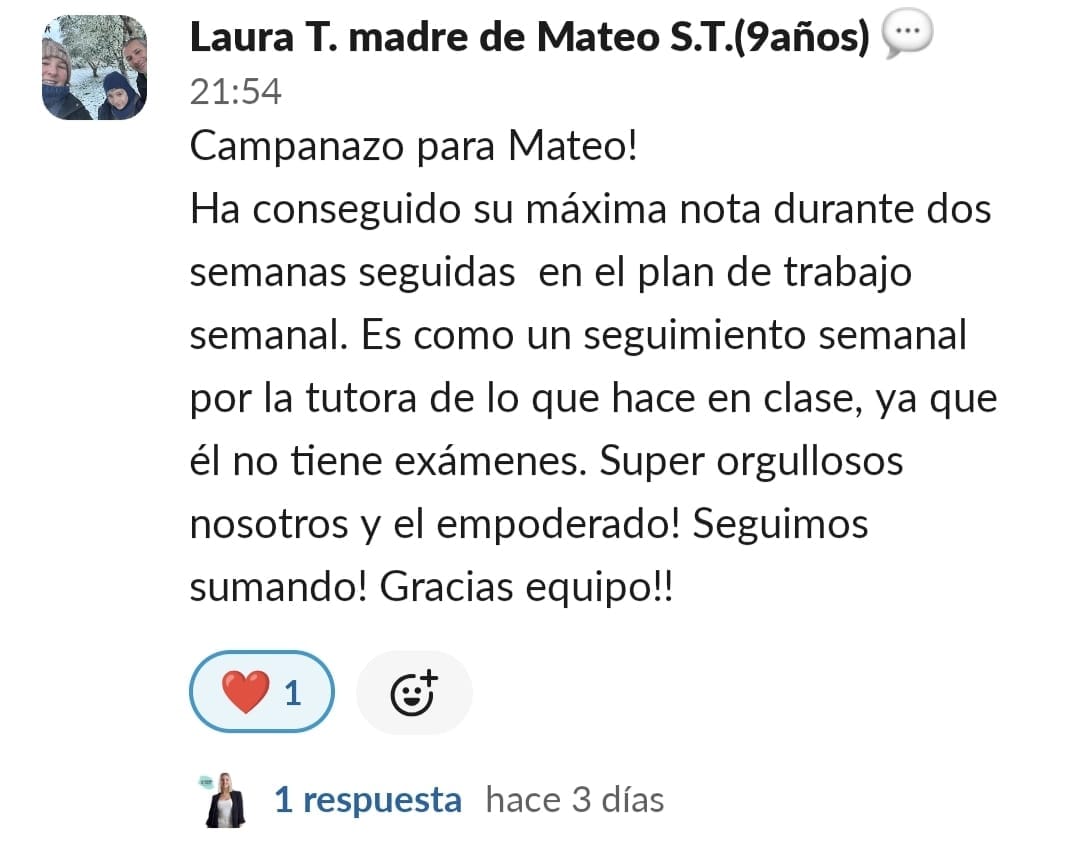 Al principio me sentía muy agobiada, perdida, frustrada, angustiada ,estresada, nerviosa y sin poder salir de esa rueda de hámster de gritos y amenazas para que hiciera los deberes. Era un caos. Entrar al programa supuso unambio de 360 grados. No tenía ni idea de lo que iba a ser pero me gustó mucho ver cómo nos ayudó en poco tiempo a cambiar nuestra relación con los deberes. A mi hijo le engancho desde el principio porque él quería hacer algo para cambiar esa rutina. Quería alguien que le ayudara y está muy contento. Esa energía que trasmite los engancha. Y a nosotras también. Por lo menos a mí. La verdad que con el poco tiempo que tienen que invertir todo lo que consiguen. Es maravilloso la verdad.....solo tengo palabras bonitas....y no es ningún cumplido es la realidad. He notado un cambio radican en la organización y planificación de los deberes y exámenes. Rapidez a la hora de acabar las tareas. Los resultados académicos van en aumento. Me hacen sentir la mejor madre del mundo por haber sabido encontrar la mejor opción sin duda de ayudarle en su camino. Me siento muy orgullosa y empoderada. Muy agradecida la verdad. Muy afortunada. Porque es verdad que lo necesitábamos los dos. Estábamos muy pedidos y no sabíamos cómo seguir. Tenemos esa luz que necesitábamos que nos alumbrara el camino .