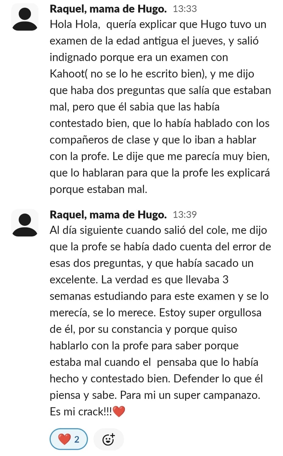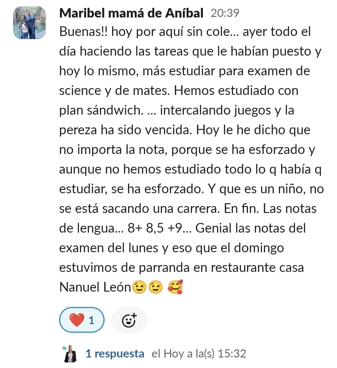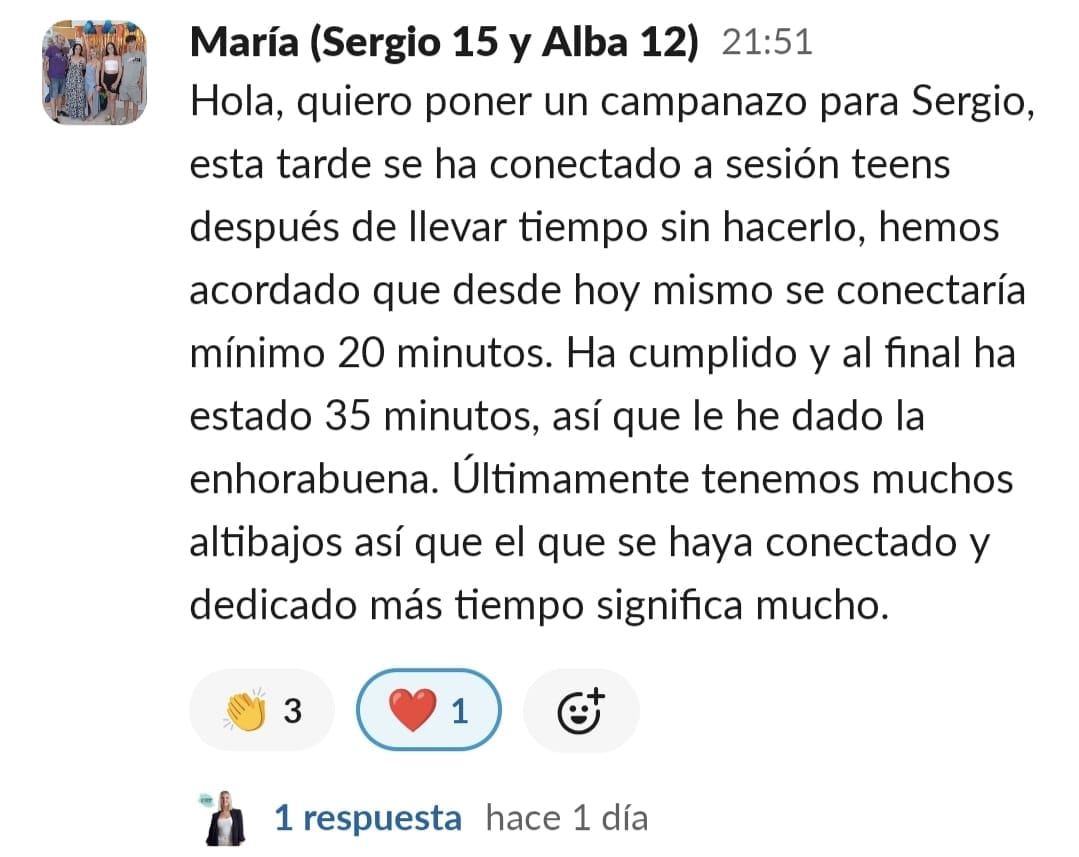 Al principio me sentía muy agobiada, perdida, frustrada, angustiada ,estresada, nerviosa y sin poder salir de esa rueda de hámster de gritos y amenazas para que hiciera los deberes. Era un caos. Entrar al programa supuso unambio de 360 grados. No tenía ni idea de lo que iba a ser pero me gustó mucho ver cómo nos ayudó en poco tiempo a cambiar nuestra relación con los deberes. A mi hijo le engancho desde el principio porque él quería hacer algo para cambiar esa rutina. Quería alguien que le ayudara y está muy contento. Esa energía que trasmite los engancha. Y a nosotras también. Por lo menos a mí. La verdad que con el poco tiempo que tienen que invertir todo lo que consiguen. Es maravilloso la verdad.....solo tengo palabras bonitas....y no es ningún cumplido es la realidad. He notado un cambio radican en la organización y planificación de los deberes y exámenes. Rapidez a la hora de acabar las tareas. Los resultados académicos van en aumento. Me hacen sentir la mejor madre del mundo por haber sabido encontrar la mejor opción sin duda de ayudarle en su camino. Me siento muy orgullosa y empoderada. Muy agradecida la verdad. Muy afortunada. Porque es verdad que lo necesitábamos los dos. Estábamos muy pedidos y no sabíamos cómo seguir. Tenemos esa luz que necesitábamos que nos alumbrara el camino .