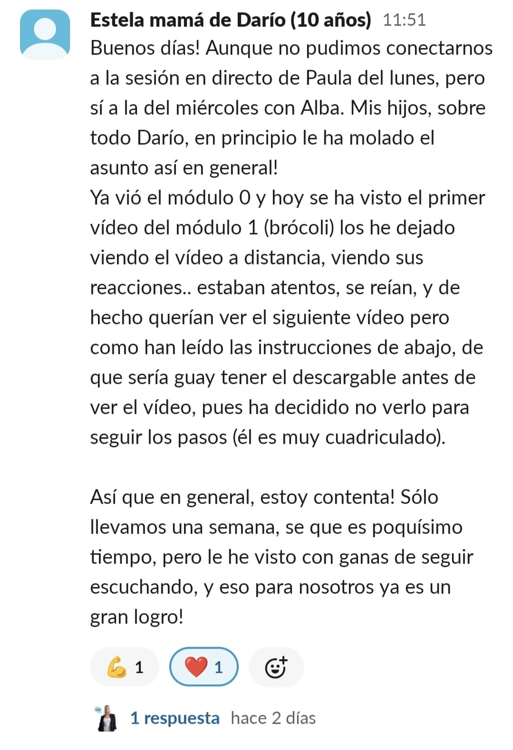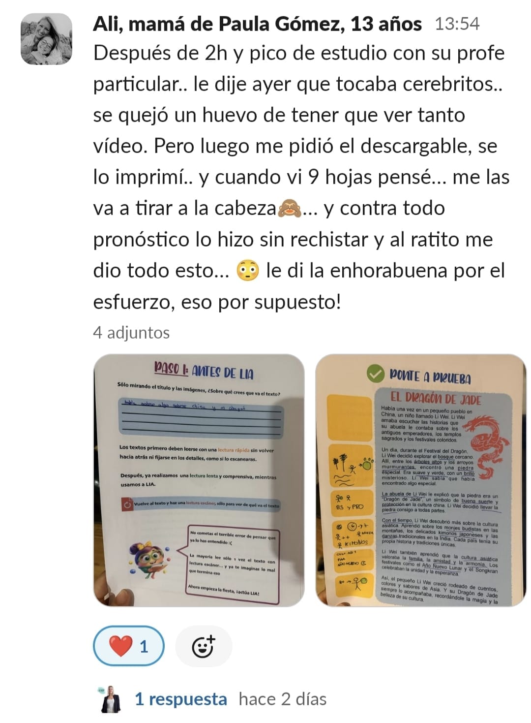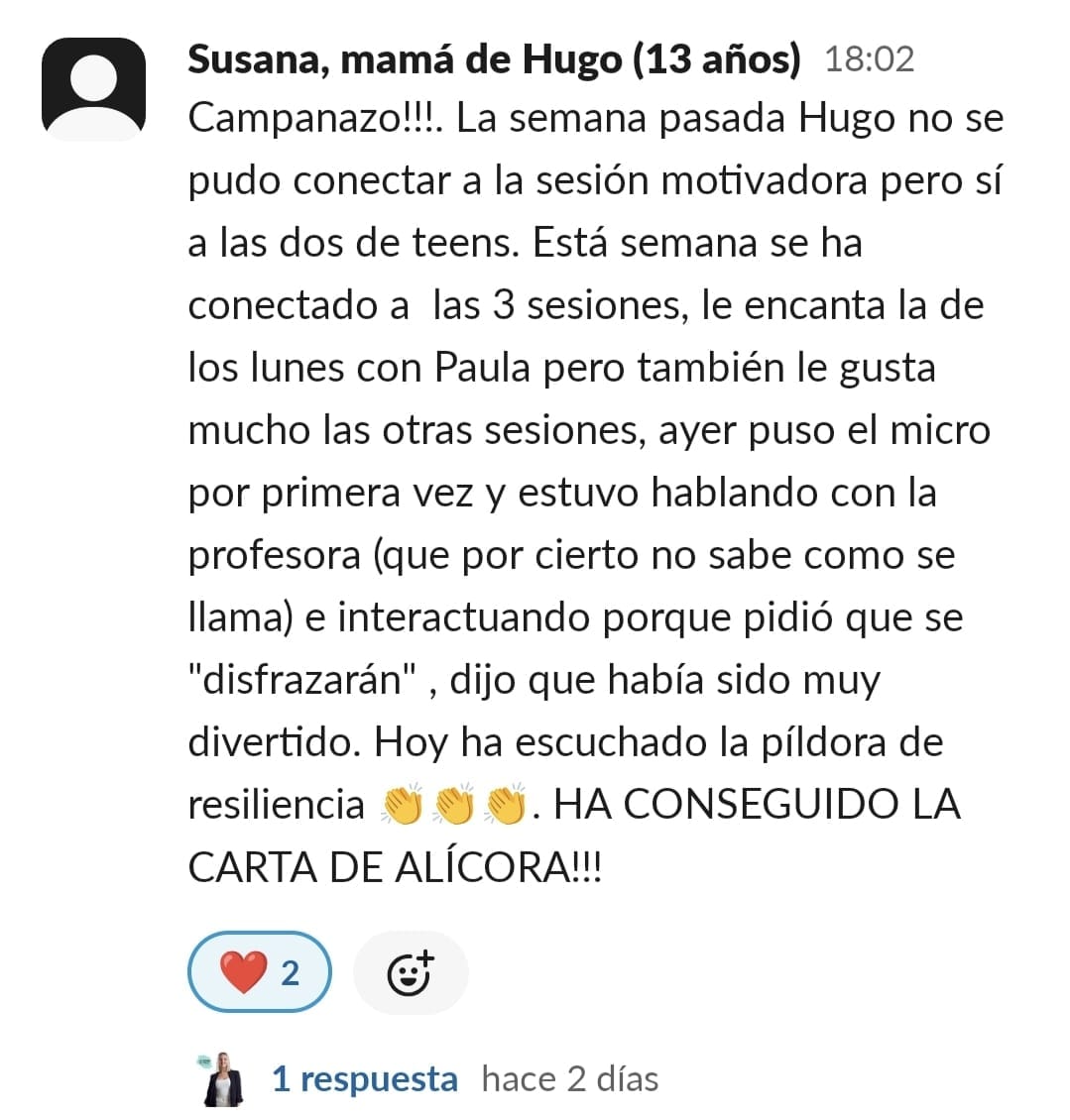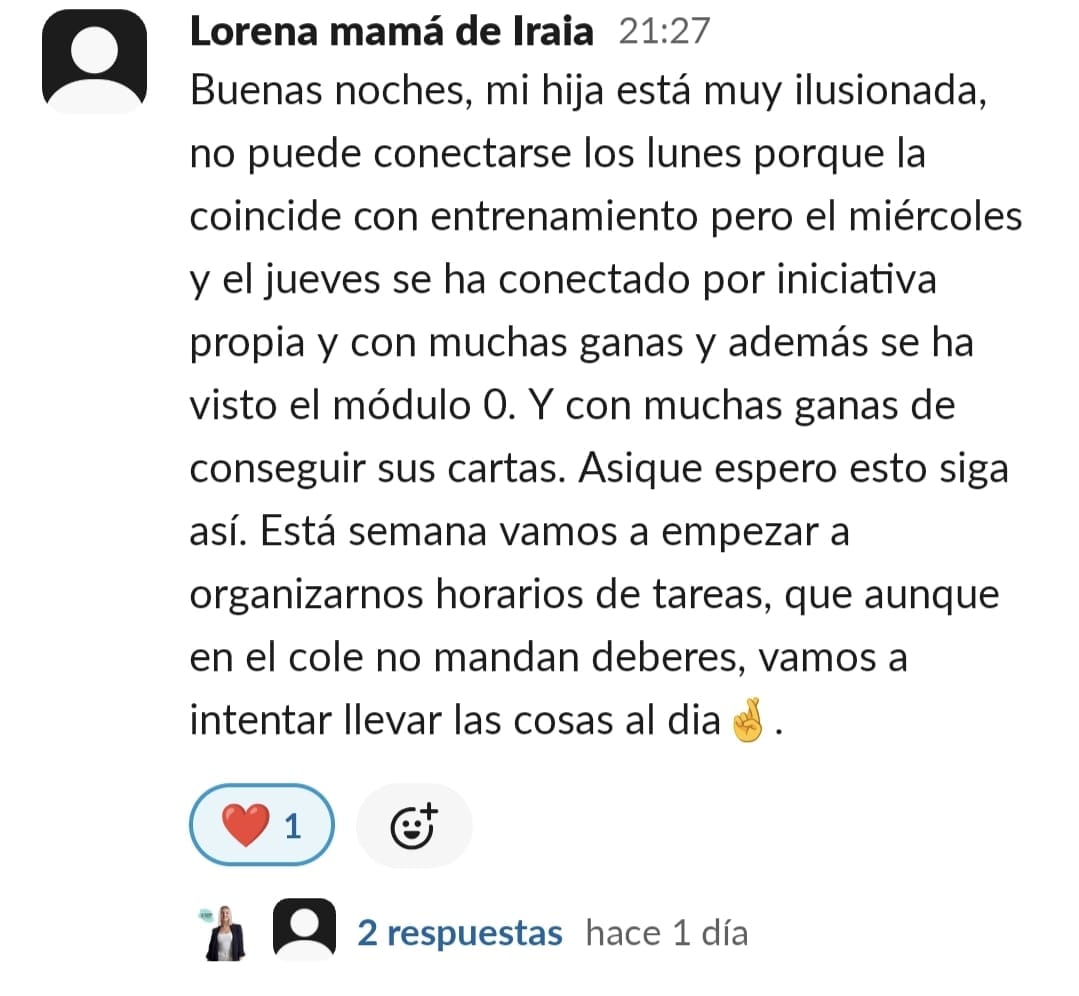 Al principio estaba indecisa porque no sabia como era realmente el programa, al no ser en linea con la profesora no sabia si realmente iba a poder seguirlo y funcionar. Despues con el paso de las lecciones fuimos cogiendo mas confianza y cambiando la opinon. El primero el poder entender una lectura aplicando a LIA (una maravilla), siempre habia dicho que leia y leia y nunca se le quedaba lo que leia....El segundo que fuera capaz de meterse en su habitacion para poder hacer los deberes el solo, sin discursiones ni peleas continuas, el tercero el metodo de estudio usando MR Icono y CCC., le es mucho mas facil la aplicacion para estudiar y el a la vez se siente mas motivado. Como madre te diría que sin dudarlo lo pruebes. No te arrepentirás. Es normal tener muchas dudas pero poco a poco irán resolviendose y además tenemos una super comunidad donde todas las mamis y papis nos apoyamos y ayudamos , después de Paula claro