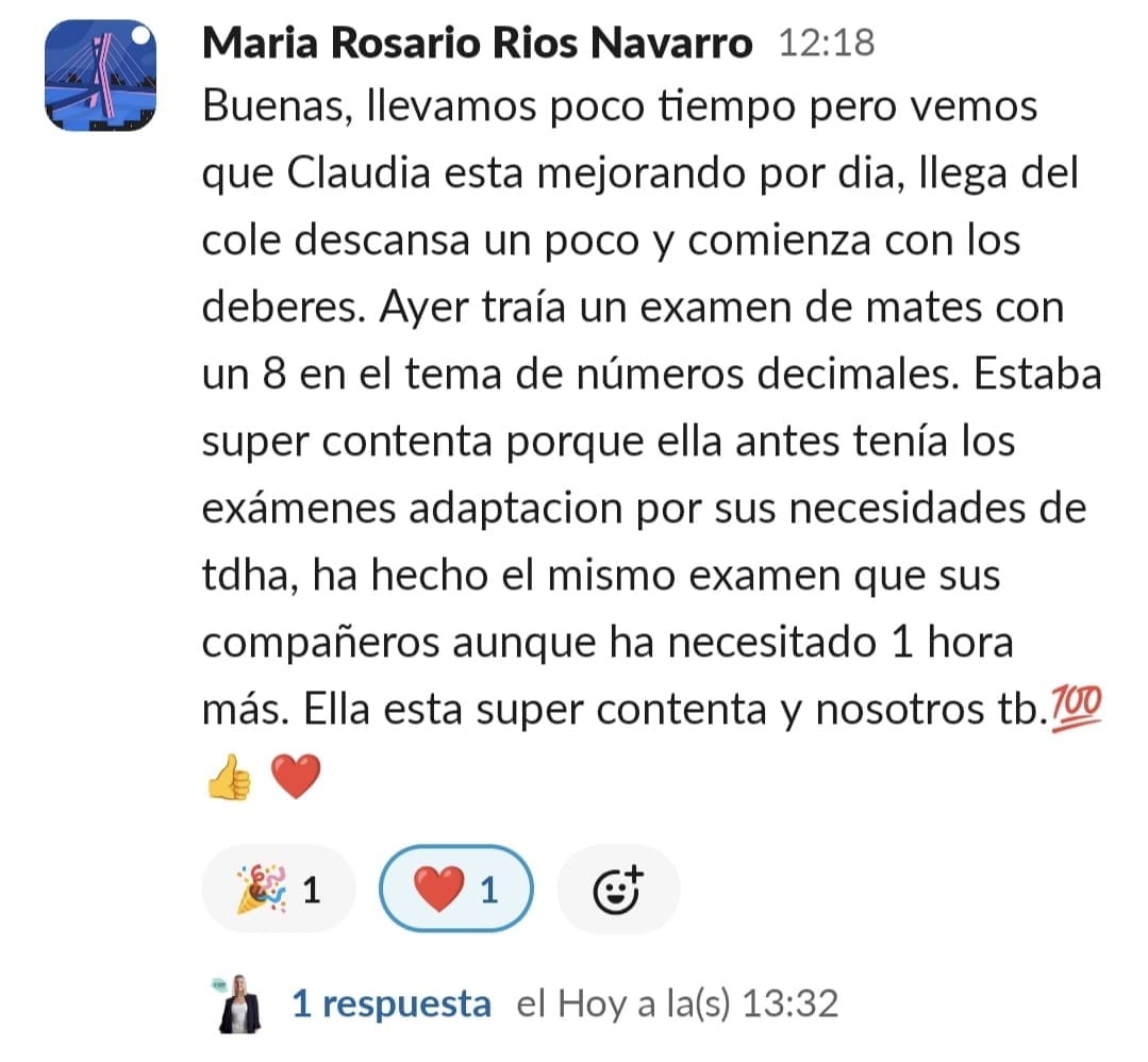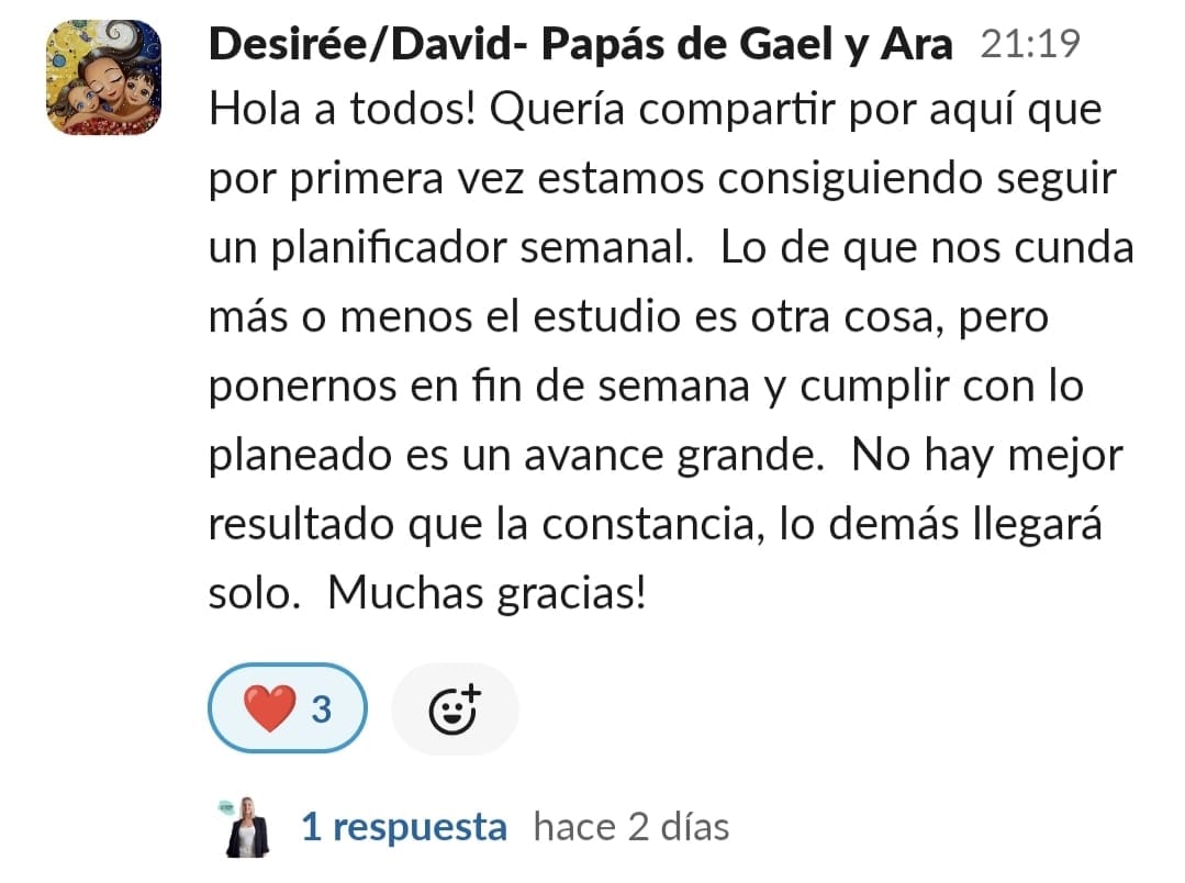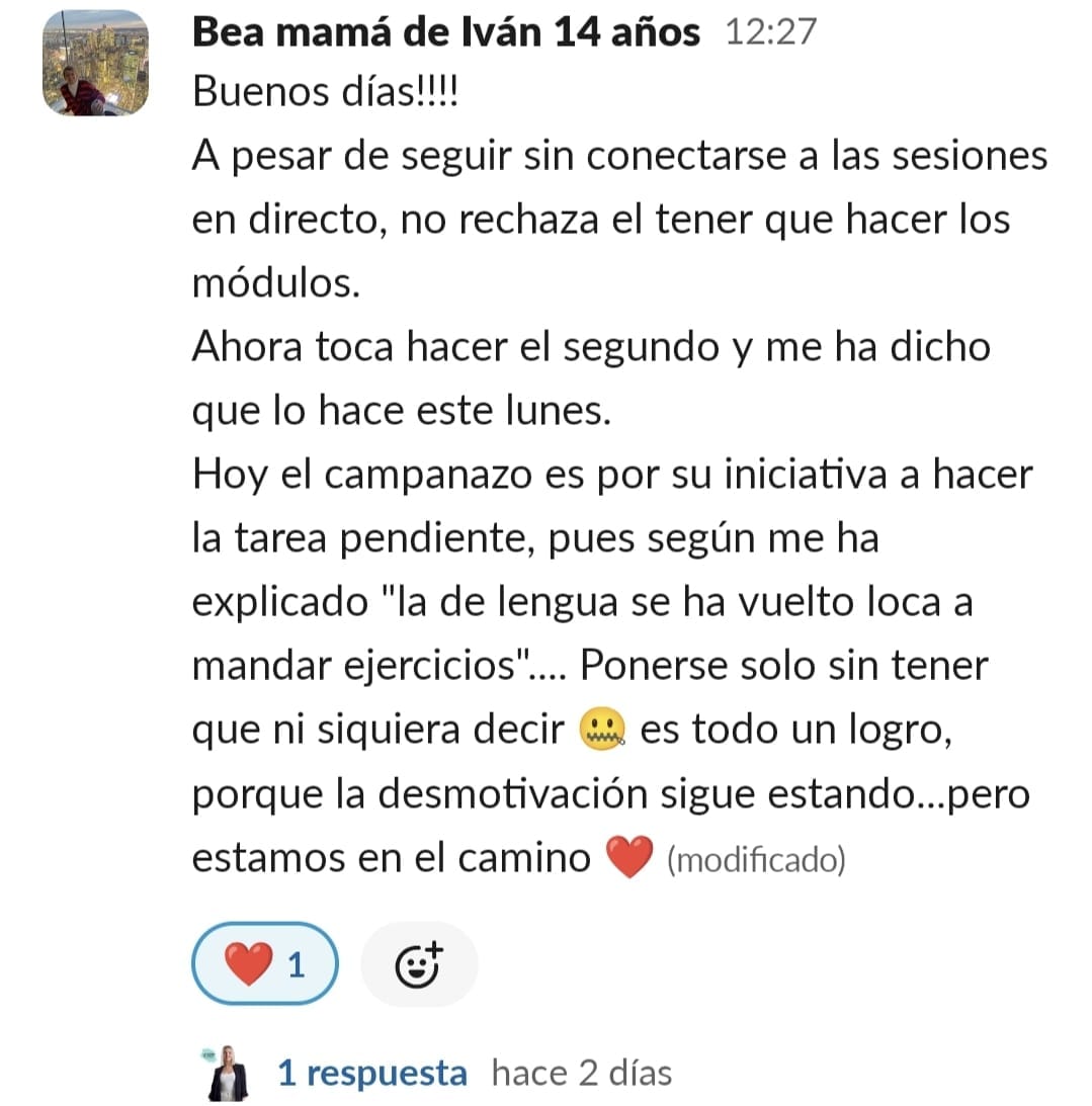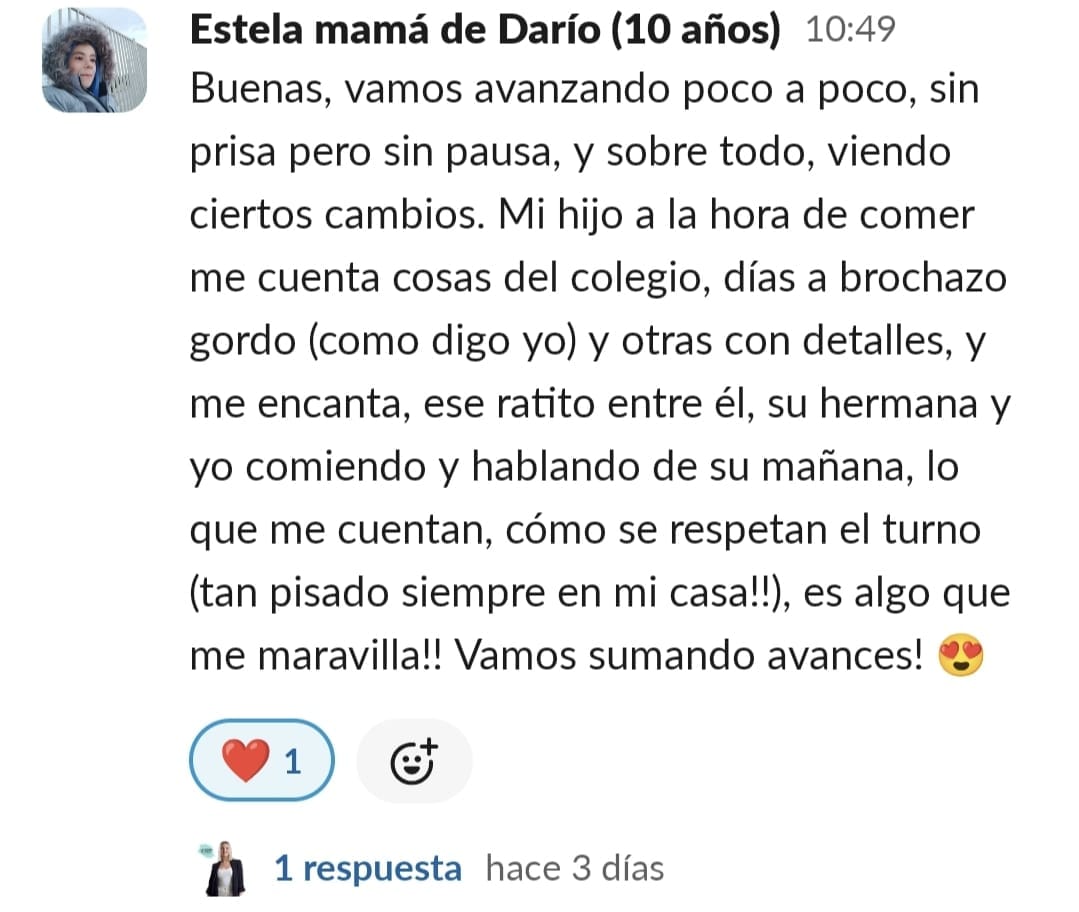Yo al principio tenía una desesperación muy grande. Cuando entramos no imaginaba tanta información y soluciones, estaba segura que sería estupendo, pero es que ha sido y sigue siendo maravilloso. Los resultados, los veo claramente, no solo el niño, también en mi, ya que he aprendido prácticamente sin esfuerzo a entenderlo y ayudarlo, en el motivación y confianza, y para mí confianza en el mismo es como si hubiera ganado el mayor premio posible. Es un gran paso, sobre todo de compromiso con una misma, pero a la vez es liberación, ir viendo cómo cambia todo en casa. No solo los estudios, sino la organización del hogar, más tranquilidad, más paciencia y comprensión