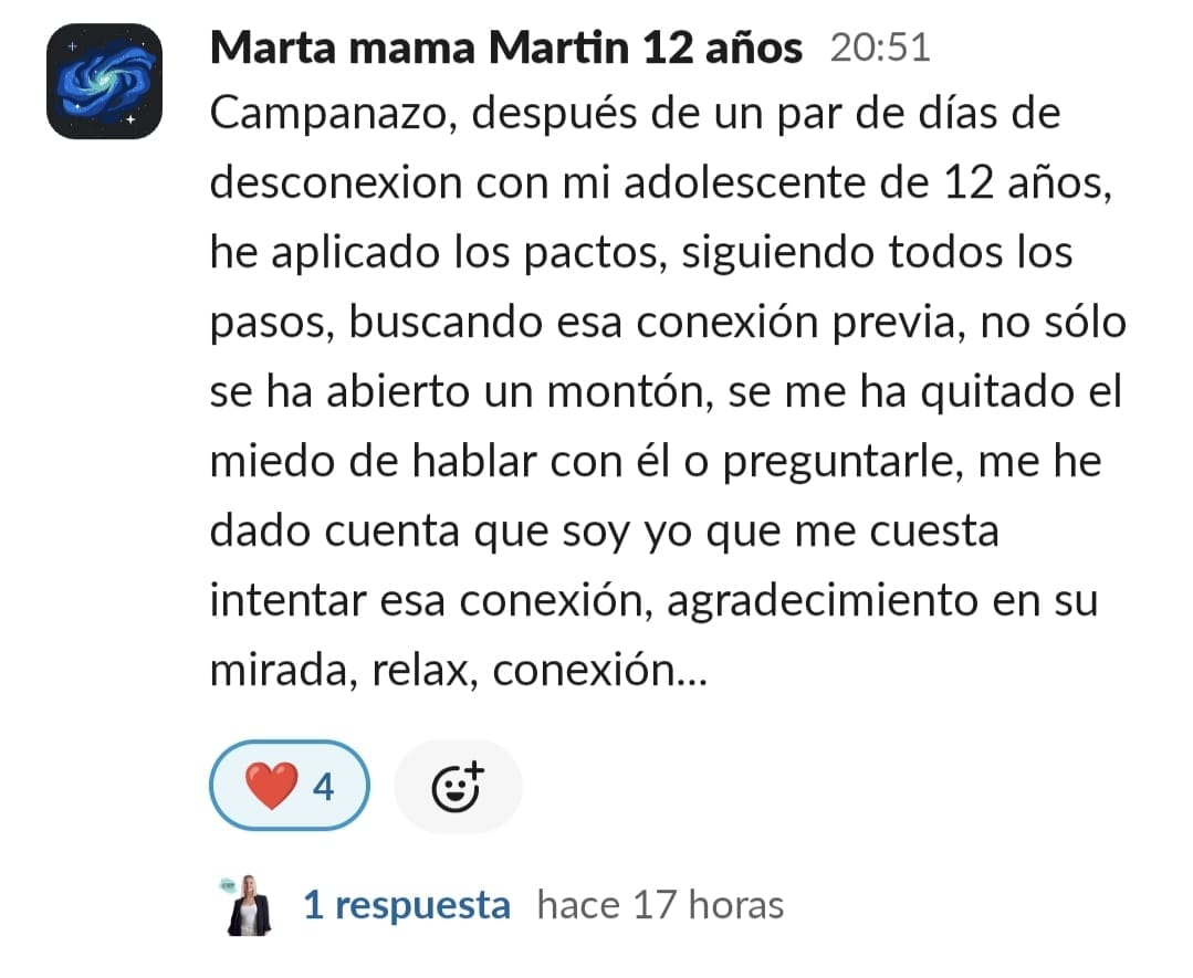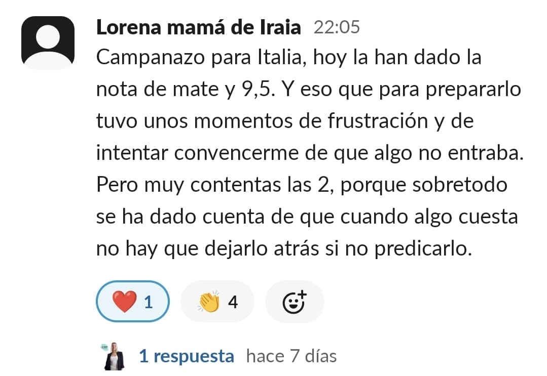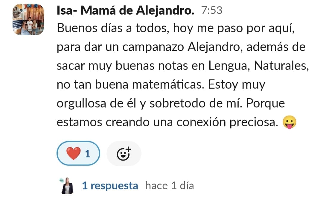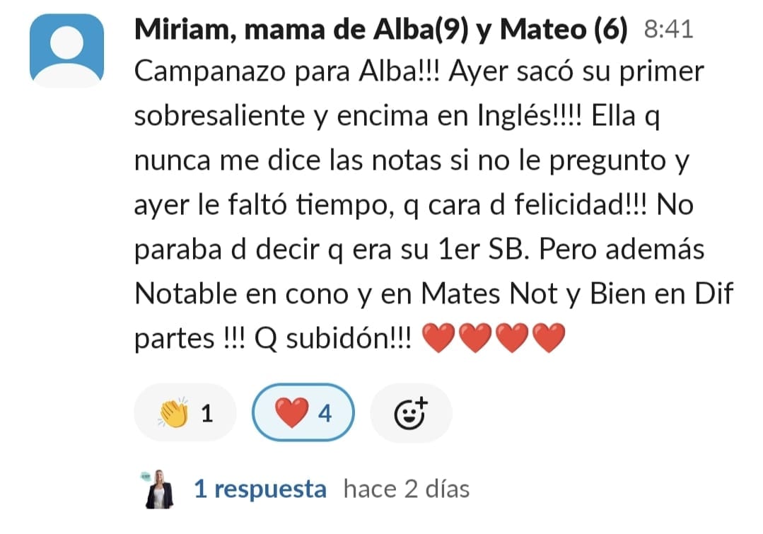 Yo al principio tenía una desesperación muy grande. Cuando entramos no imaginaba tanta información y soluciones, estaba segura que sería estupendo, pero es que ha sido y sigue siendo maravilloso. Los resultados, los veo claramente, no solo el niño, también en mi, ya que he aprendido prácticamente sin esfuerzo a entenderlo y ayudarlo, en el motivación y confianza, y para mí confianza en el mismo es como si hubiera ganado el mayor premio posible. Es un gran paso, sobre todo de compromiso con una misma, pero a la vez es liberación, ir viendo cómo cambia todo en casa. No solo los estudios, sino la organización del hogar, más tranquilidad, más paciencia y comprensión