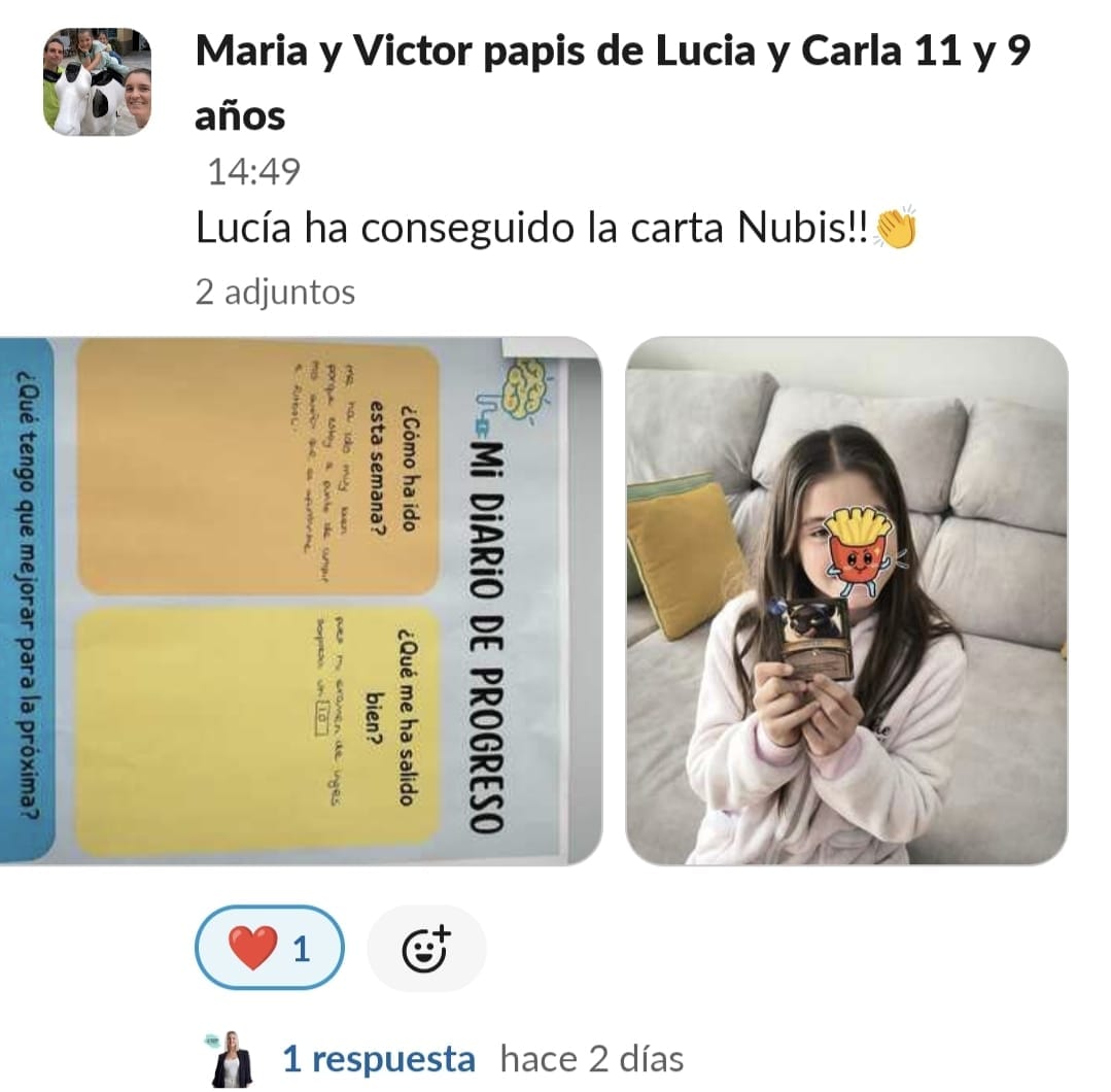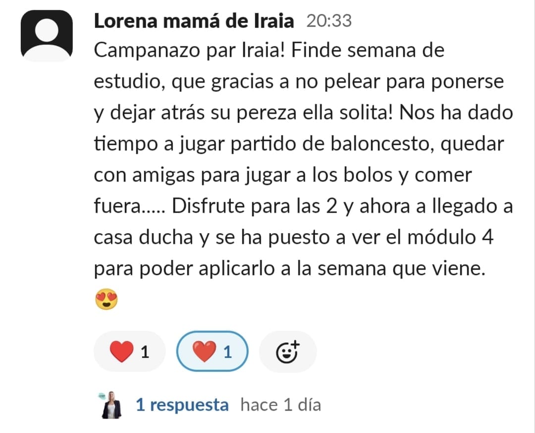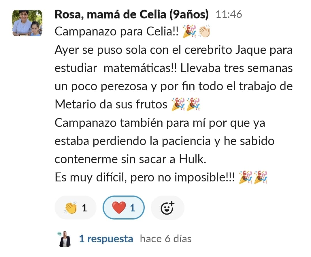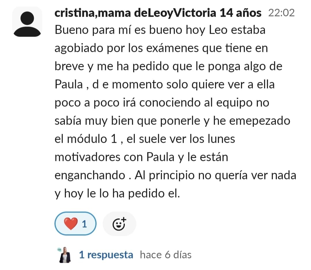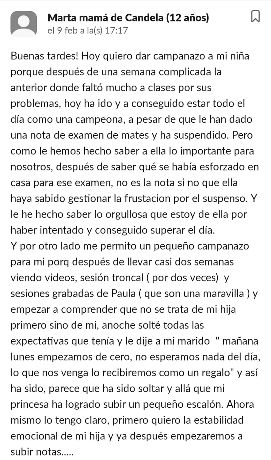 A nuestra hija Paula de 11 años, le costaba mucho ponerse a estudiar, no sabía hacerlo sola, se distraía constantemente y se frustraba enseguida. La primera en cambiar el "chip" fui yo. Con las masterclass, los directos y las herramientas que nos da Paula en GPS, entendí como funciona el cerebro del niño y comencé a comprenderla y aceptar que sería un proceso lento pero que, aplicando las herramientas correctas con constancia, conseguiríamos crear nuevas neuroasociaciones en su cerebro que la motivaran en el estudio. Ella empezó con poca motivación, pero los directos con Paula han sido clave para que viera que hay muchos niños en su situación y que están mejorando con esfuerzo, día a día. Y que aprender puede llegar a ser hasta divertido... y que hasta los más pequeños logros son dignos de celebración. Mi hija ha empezado a aplicar muchas de las herramientas de cerebritos y ha conseguido ponerse a estudiar con motor propio. Es la mejor inversión que puedes hacer si quieres que tu hijo crezca en autoestima, y entienda que no es que no pueda, si no que le faltan las herramientas adecuadas para convertirse en un buen esgudiante...y en cerebritos las va a encontrar, sólo hay que aplicarlas con constancia y entender que no es un proceso ni rapido ni lineal, pero sí efectivo. GRACIAS PAULA POR TU MARAVILLOSO TRABAJO!!🥰