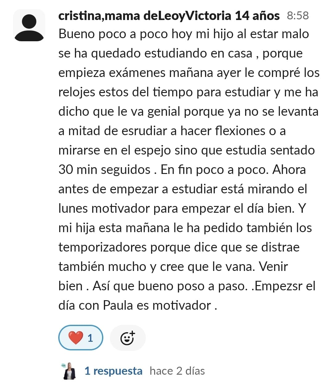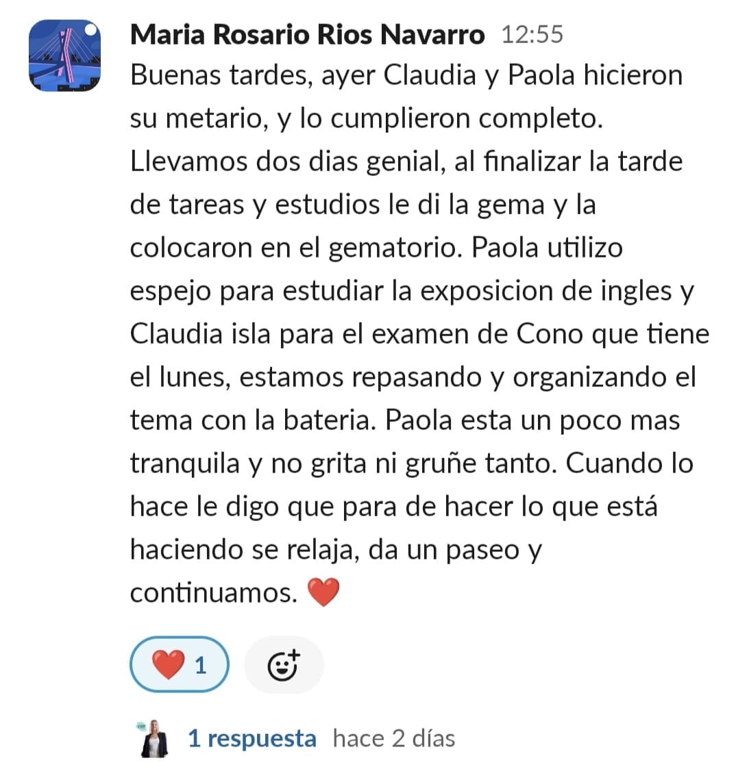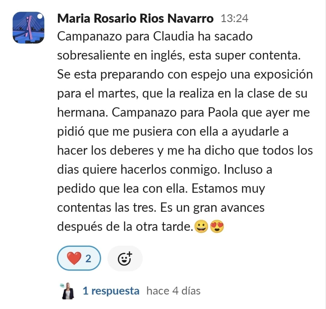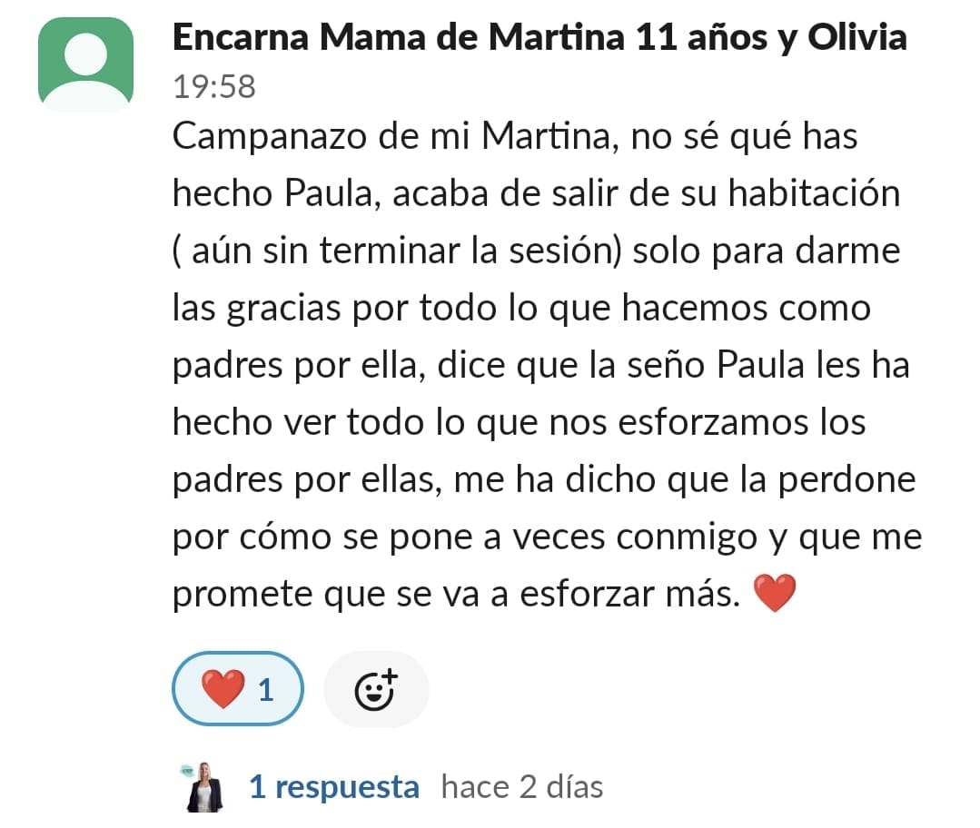 A nuestra hija Paula de 11 años, le costaba mucho ponerse a estudiar, no sabía hacerlo sola, se distraía constantemente y se frustraba enseguida. La primera en cambiar el "chip" fui yo. Con las masterclass, los directos y las herramientas que nos da Paula en GPS, entendí como funciona el cerebro del niño y comencé a comprenderla y aceptar que sería un proceso lento pero que, aplicando las herramientas correctas con constancia, conseguiríamos crear nuevas neuroasociaciones en su cerebro que la motivaran en el estudio. Ella empezó con poca motivación, pero los directos con Paula han sido clave para que viera que hay muchos niños en su situación y que están mejorando con esfuerzo, día a día. Y que aprender puede llegar a ser hasta divertido... y que hasta los más pequeños logros son dignos de celebración. Mi hija ha empezado a aplicar muchas de las herramientas de cerebritos y ha conseguido ponerse a estudiar con motor propio. Es la mejor inversión que puedes hacer si quieres que tu hijo crezca en autoestima, y entienda que no es que no pueda, si no que le faltan las herramientas adecuadas para convertirse en un buen esgudiante...y en cerebritos las va a encontrar, sólo hay que aplicarlas con constancia y entender que no es un proceso ni rapido ni lineal, pero sí efectivo. GRACIAS PAULA POR TU MARAVILLOSO TRABAJO!!🥰
