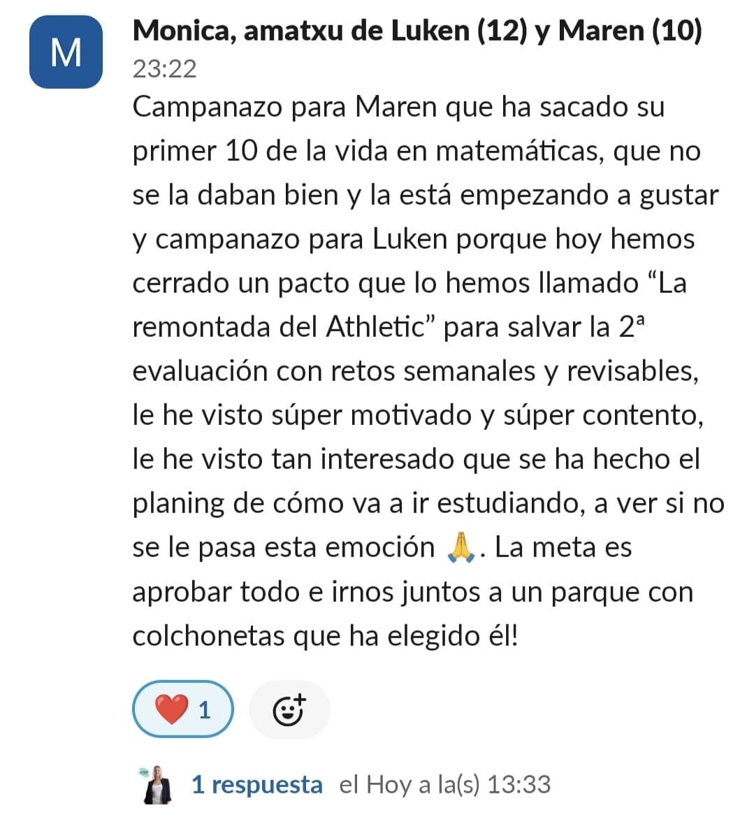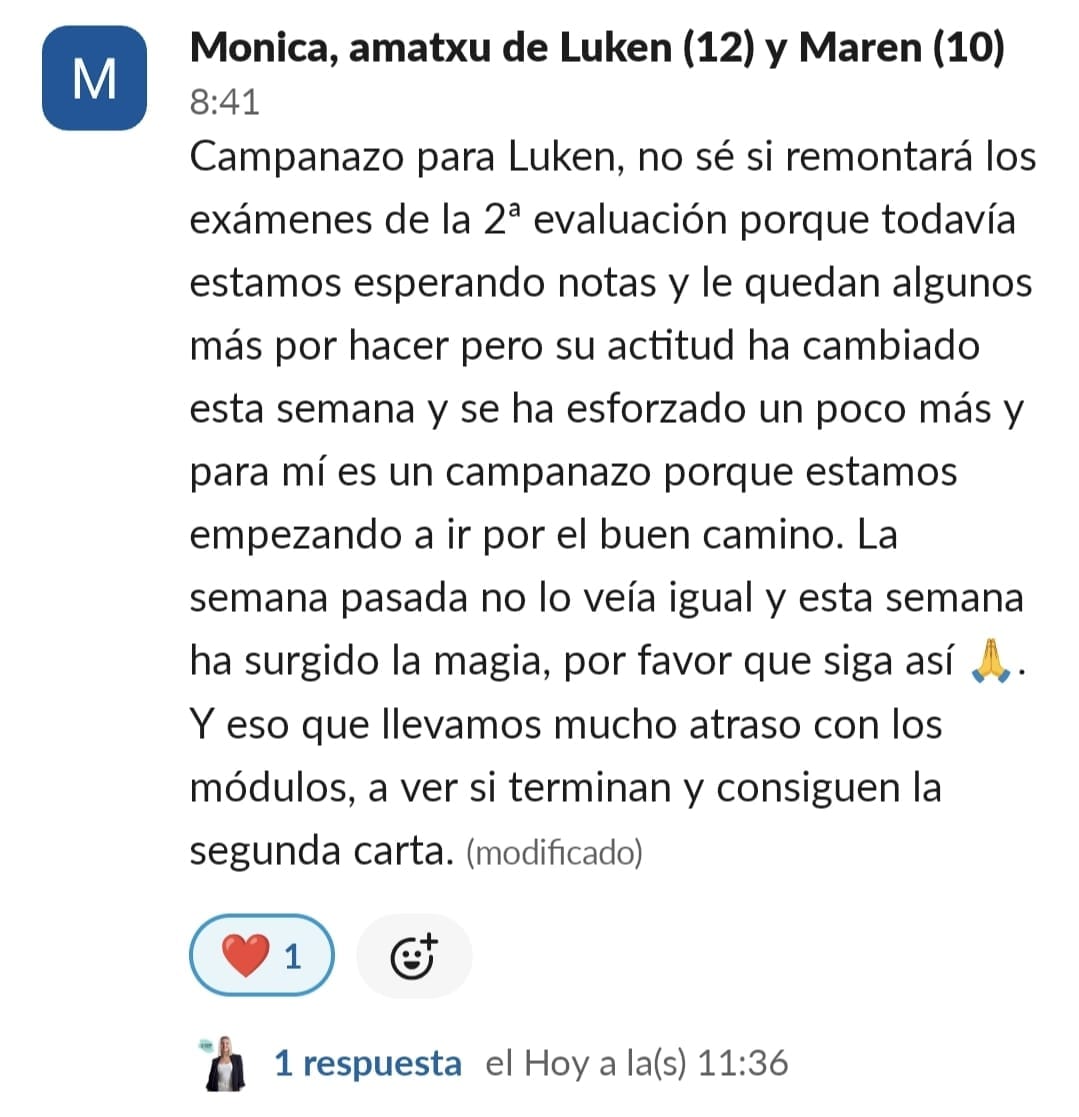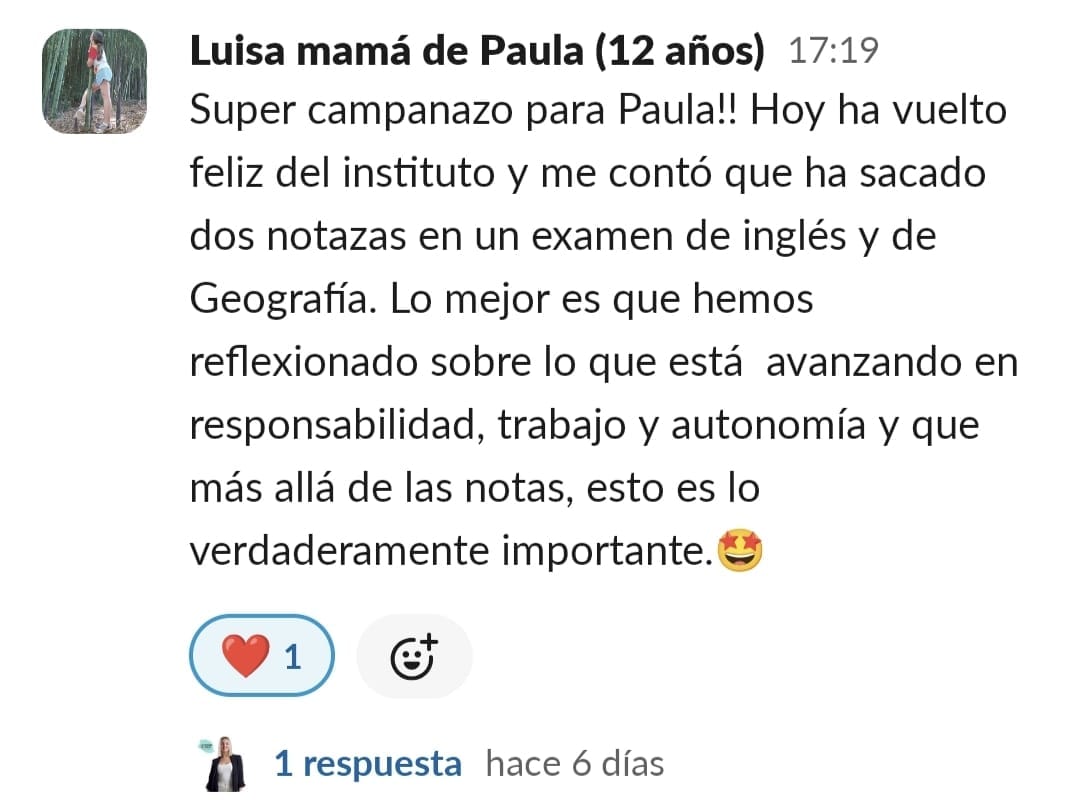 Lucía está mucho más motivada, se organiza sola las tardes de estudio y ha aprobado por primera vez un examen de Lengua, desde que empezó el curso no había aprobado ningún examen de esta asignatura.