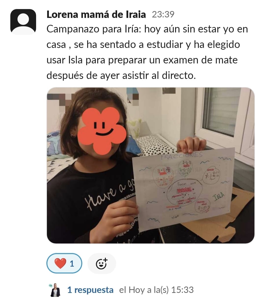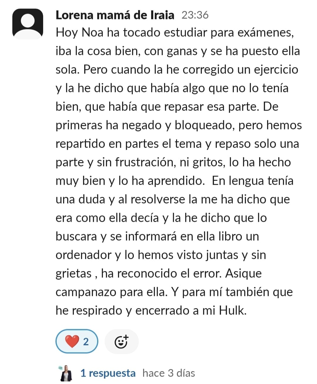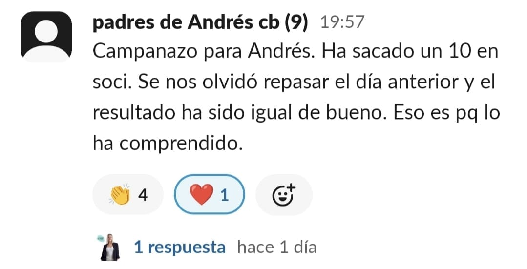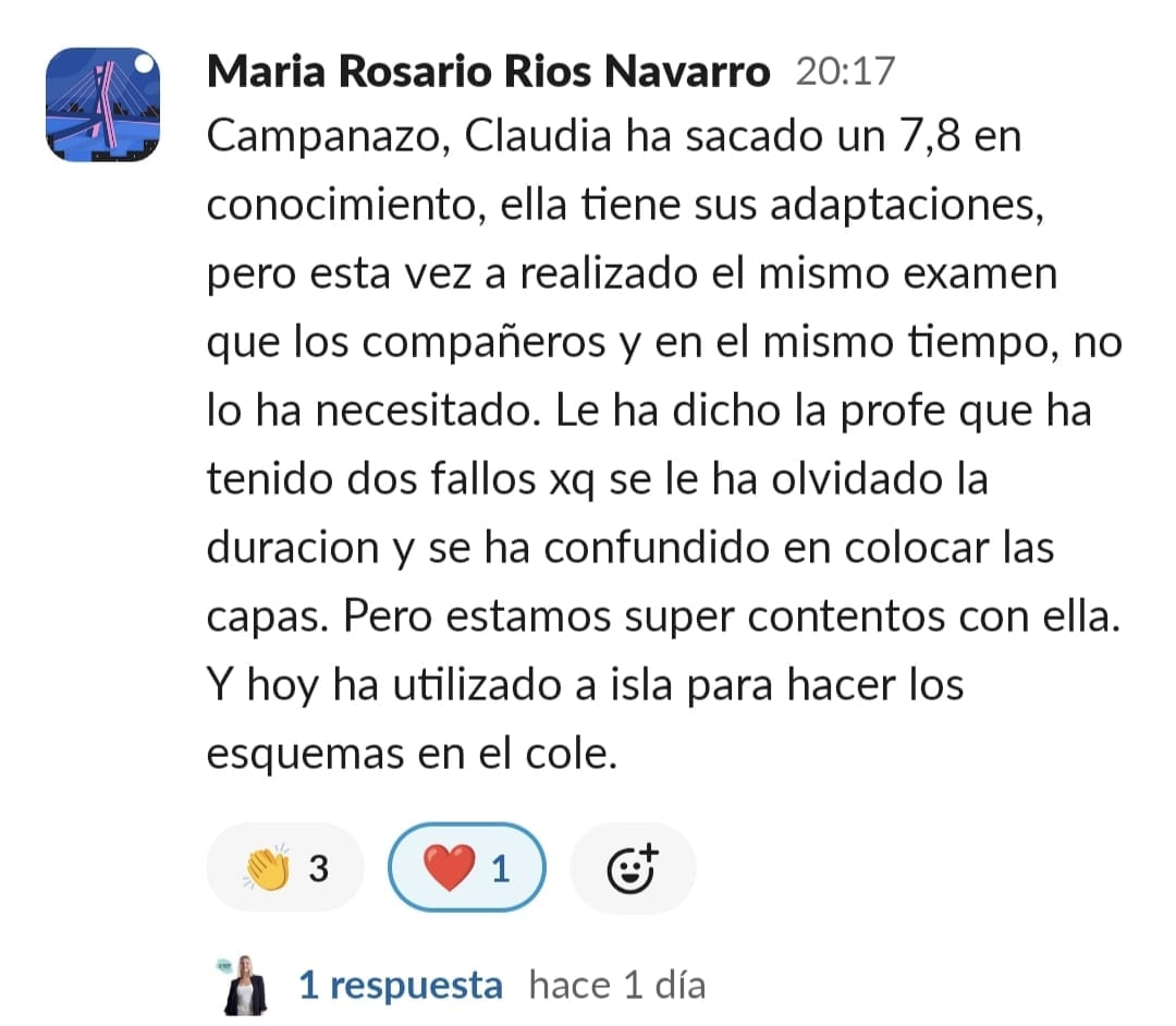 Lucía está mucho más motivada, se organiza sola las tardes de estudio y ha aprobado por primera vez un examen de Lengua, desde que empezó el curso no había aprobado ningún examen de esta asignatura.