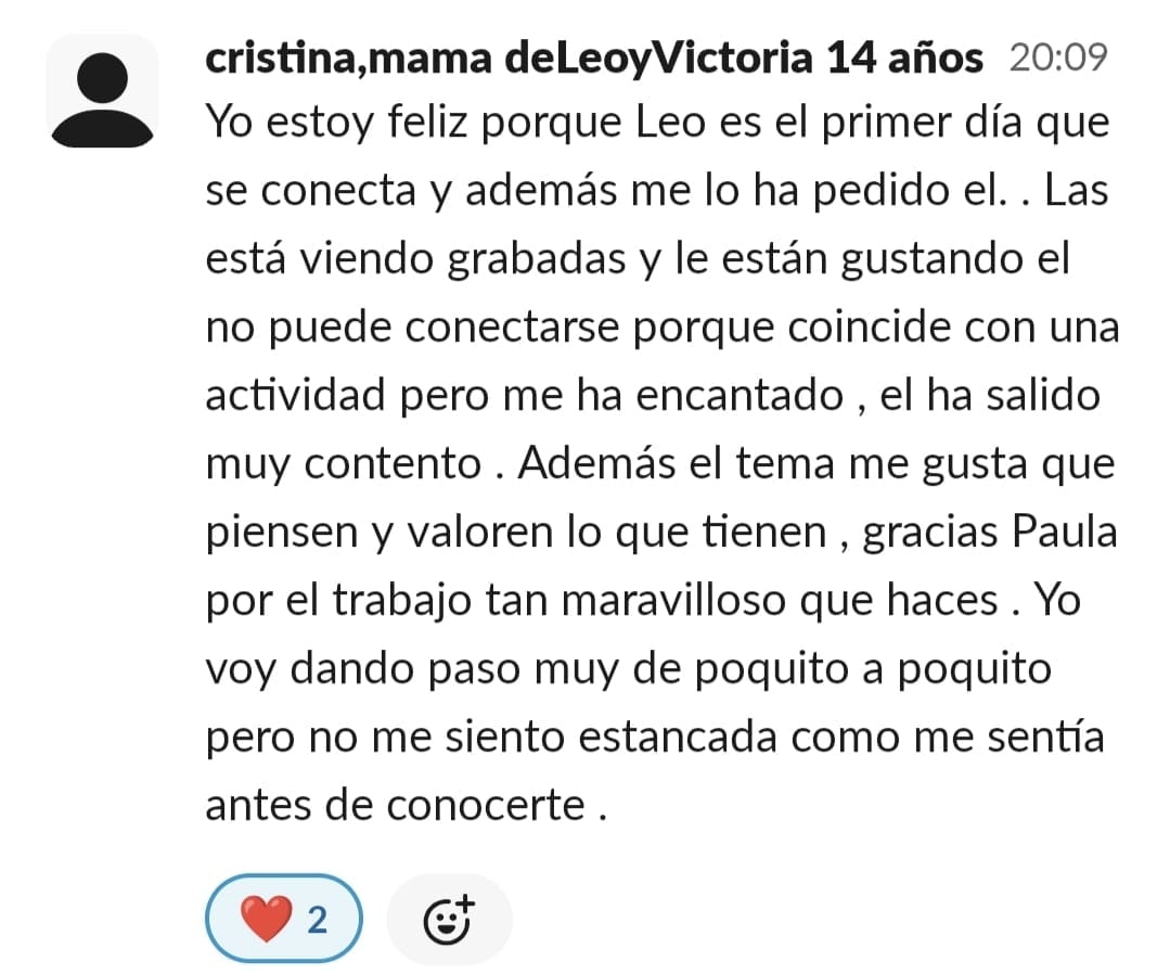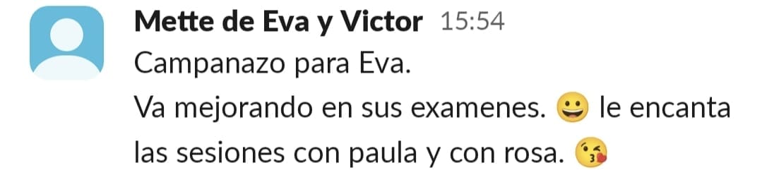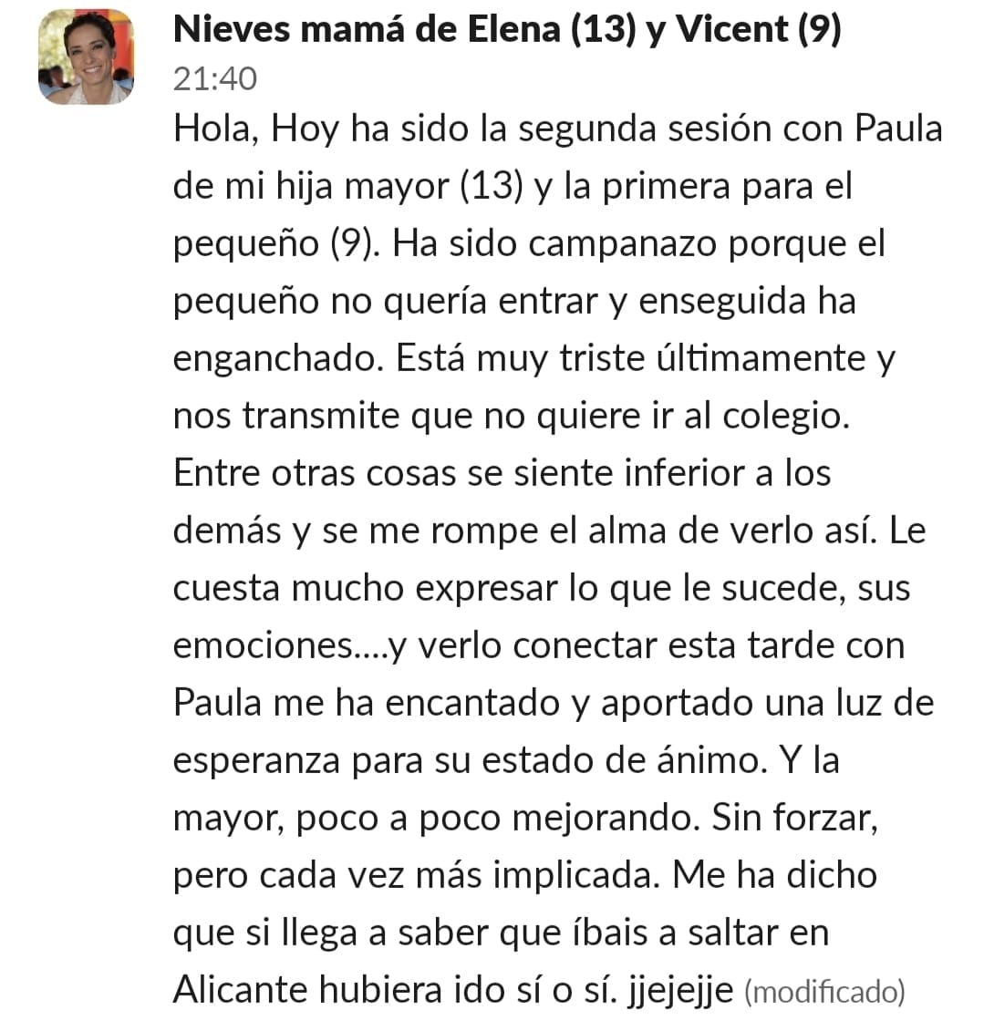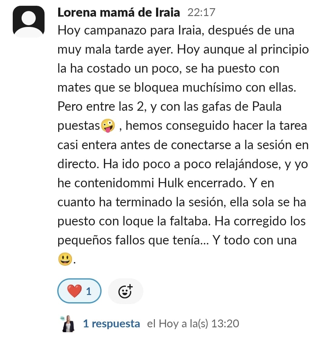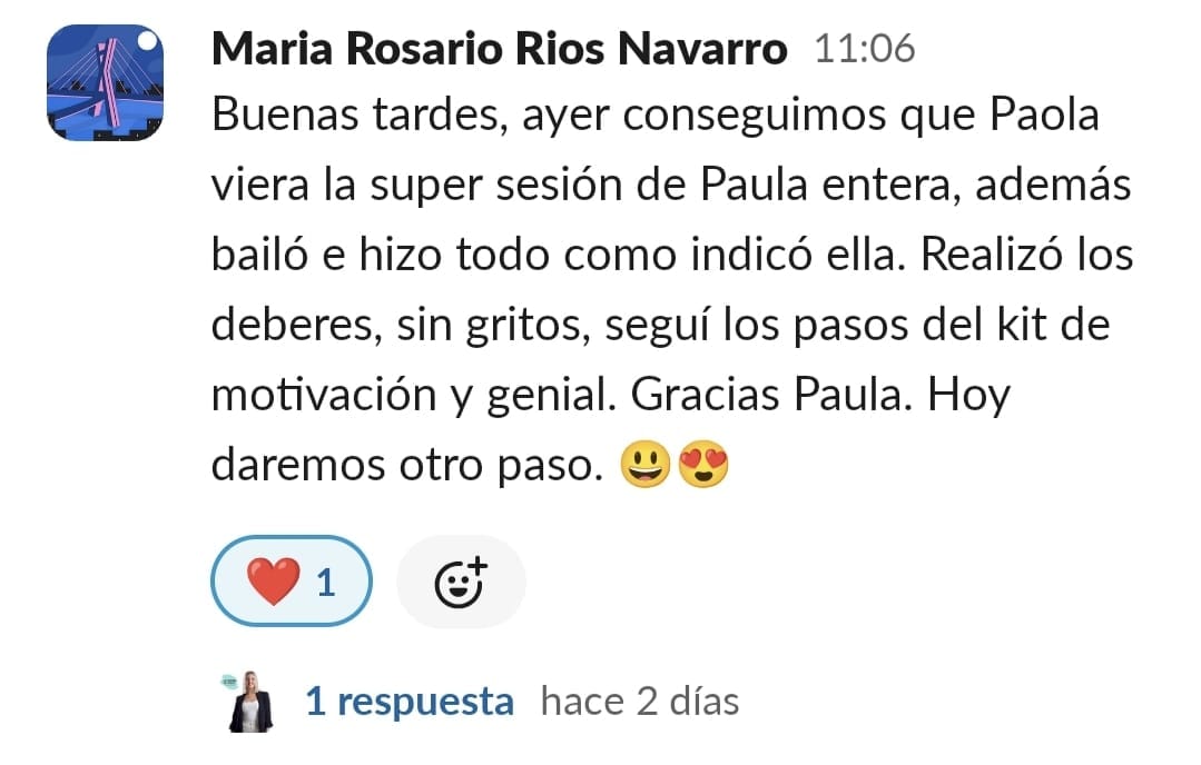 Llevo años estudiando y dedicándome a la crianza positiva... Habíamos avanzado mucho, pero en lo que respecta a las tareas escolares y al estudio, nos habíamos topado con una gran dificultad: el sistema educativo. Con un peque con lateralidad cruzada y altas capacidades, la desmotivación era brutal... Me sentía muy sola, intentando enseñar a mí hijo de otra manera. Las palabras que mejor definían mi situación eran soledad y frustración. Encontrar a una profe que entienda que hay otras maneras de aprender fue maravilloso... Y cuando comenzamos a trabajar en las sesiones, realmente vi posible cambiar el modo en el que mi peque se enfrenta a años de escolarización. Nuestros mayores éxitos han sido: El primero, que sea mi peque quien me pide avanzar en el contenido... No tener que estar "obligándole" a que lo haga. El segundo, que sea él quien me recuerde que hay alguna tarea que nos queda por hacer o que me recuerde que le mande a Paula los "deberes" El tercero, que mi hijo llegue del cole, y sin rechistar, después de comer se ponga a hacer sus tareas del cole, a leer o a repasar para un examen.