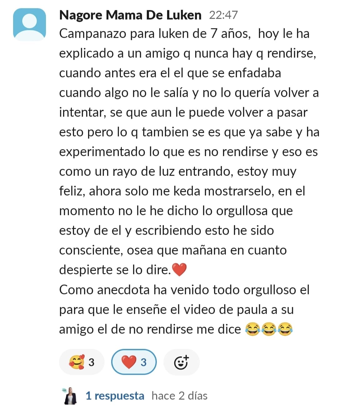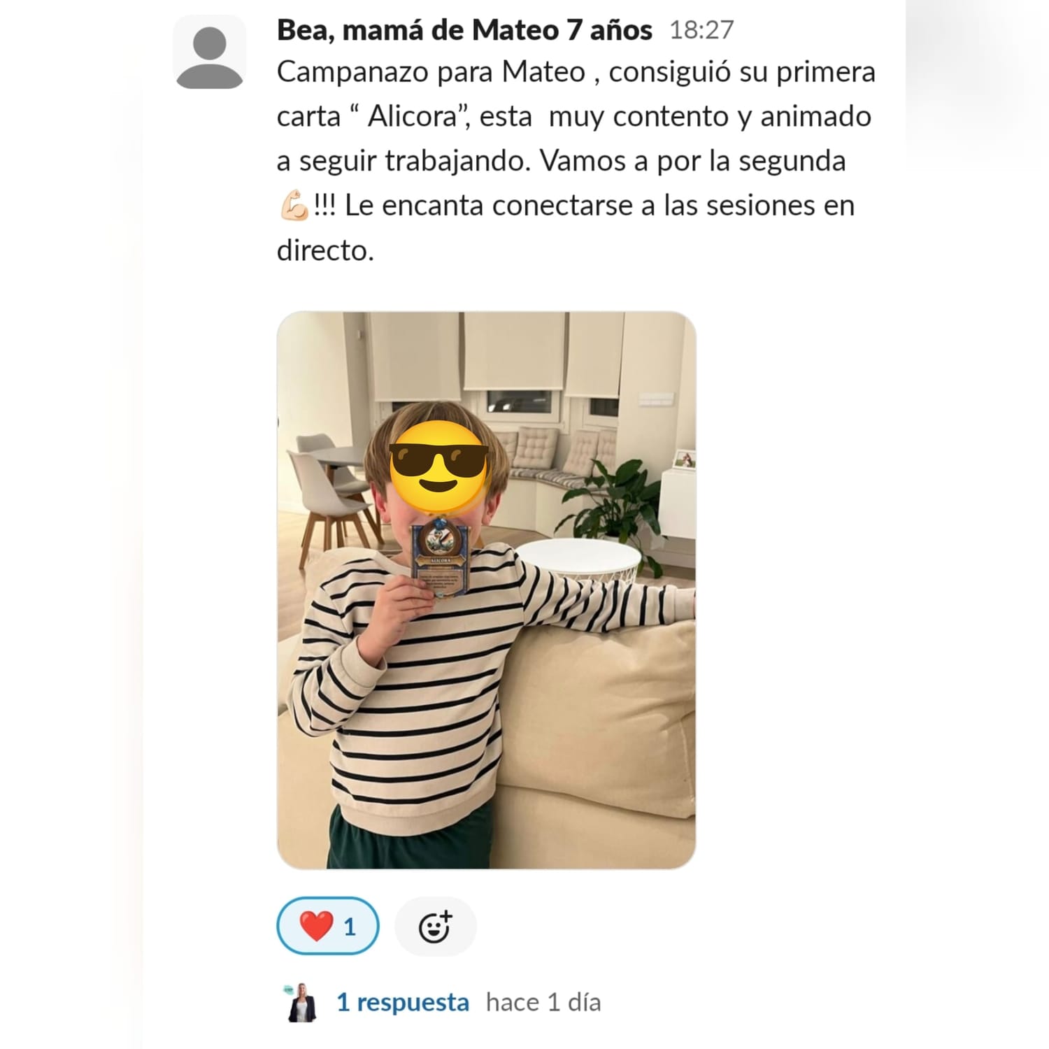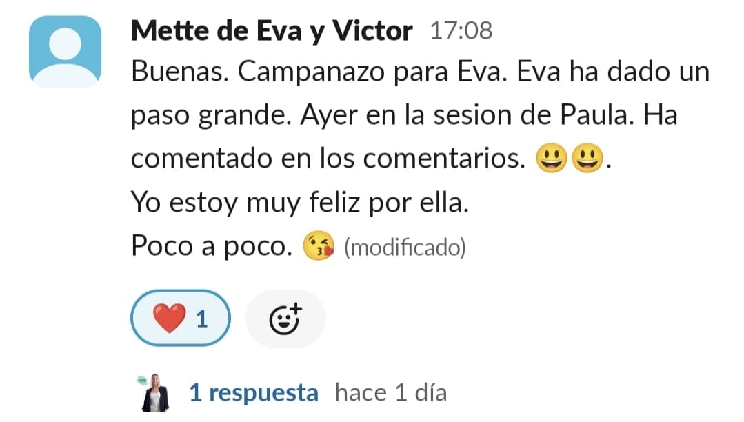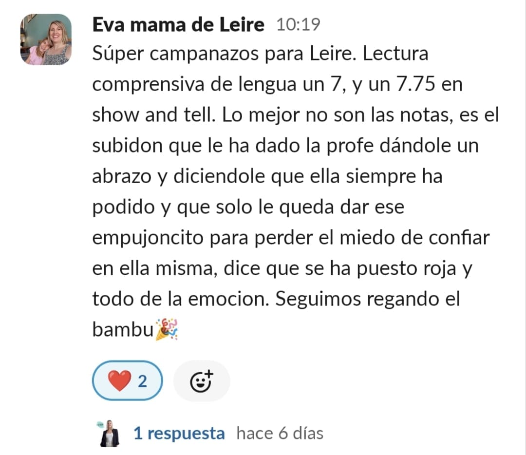 Llevo años estudiando y dedicándome a la crianza positiva... Habíamos avanzado mucho, pero en lo que respecta a las tareas escolares y al estudio, nos habíamos topado con una gran dificultad: el sistema educativo. Con un peque con lateralidad cruzada y altas capacidades, la desmotivación era brutal... Me sentía muy sola, intentando enseñar a mí hijo de otra manera. Las palabras que mejor definían mi situación eran soledad y frustración. Encontrar a una profe que entienda que hay otras maneras de aprender fue maravilloso... Y cuando comenzamos a trabajar en las sesiones, realmente vi posible cambiar el modo en el que mi peque se enfrenta a años de escolarización. Nuestros mayores éxitos han sido: El primero, que sea mi peque quien me pide avanzar en el contenido... No tener que estar "obligándole" a que lo haga. El segundo, que sea él quien me recuerde que hay alguna tarea que nos queda por hacer o que me recuerde que le mande a Paula los "deberes" El tercero, que mi hijo llegue del cole, y sin rechistar, después de comer se ponga a hacer sus tareas del cole, a leer o a repasar para un examen.