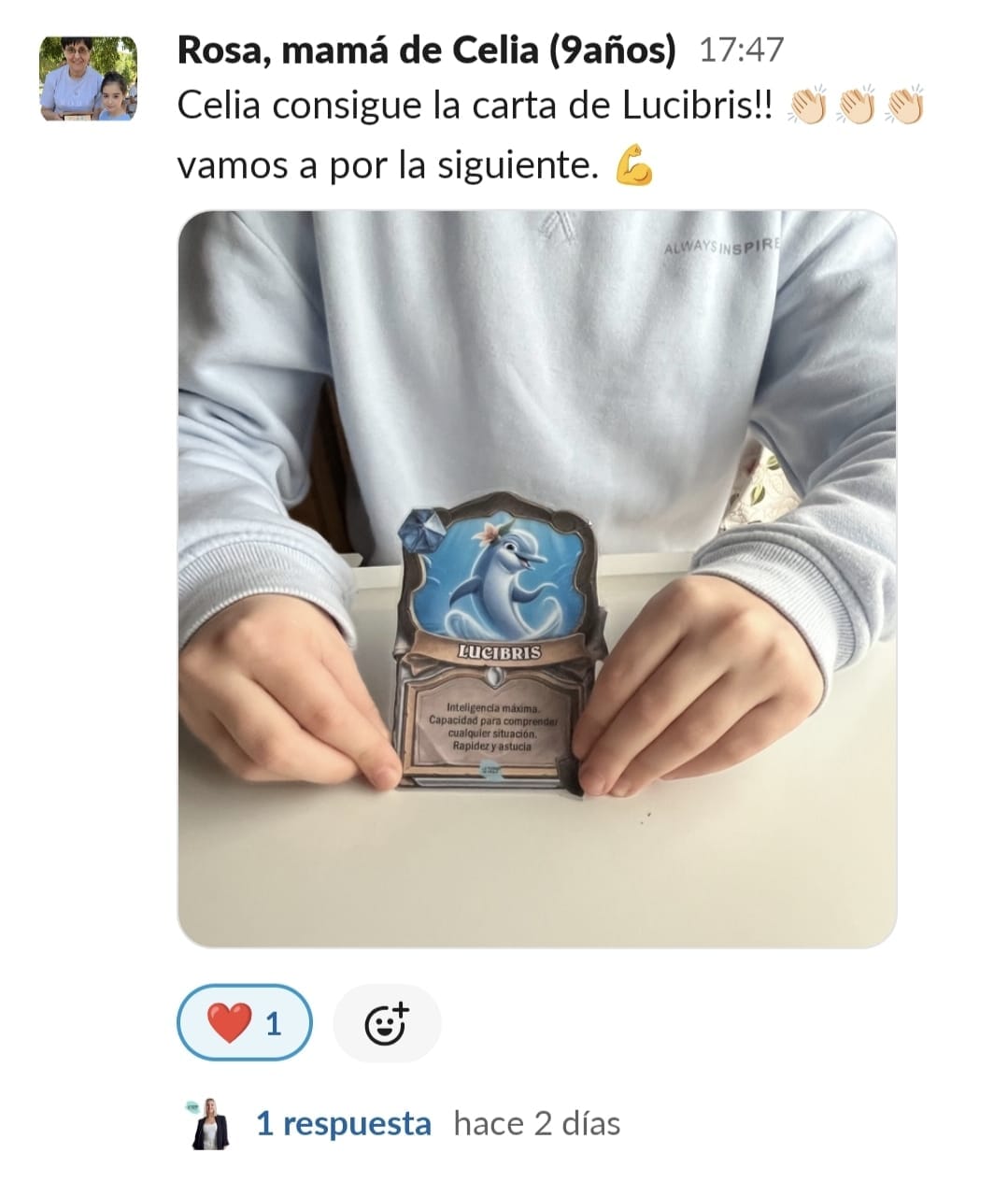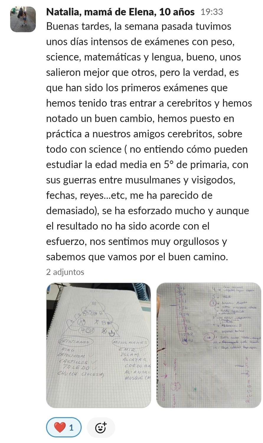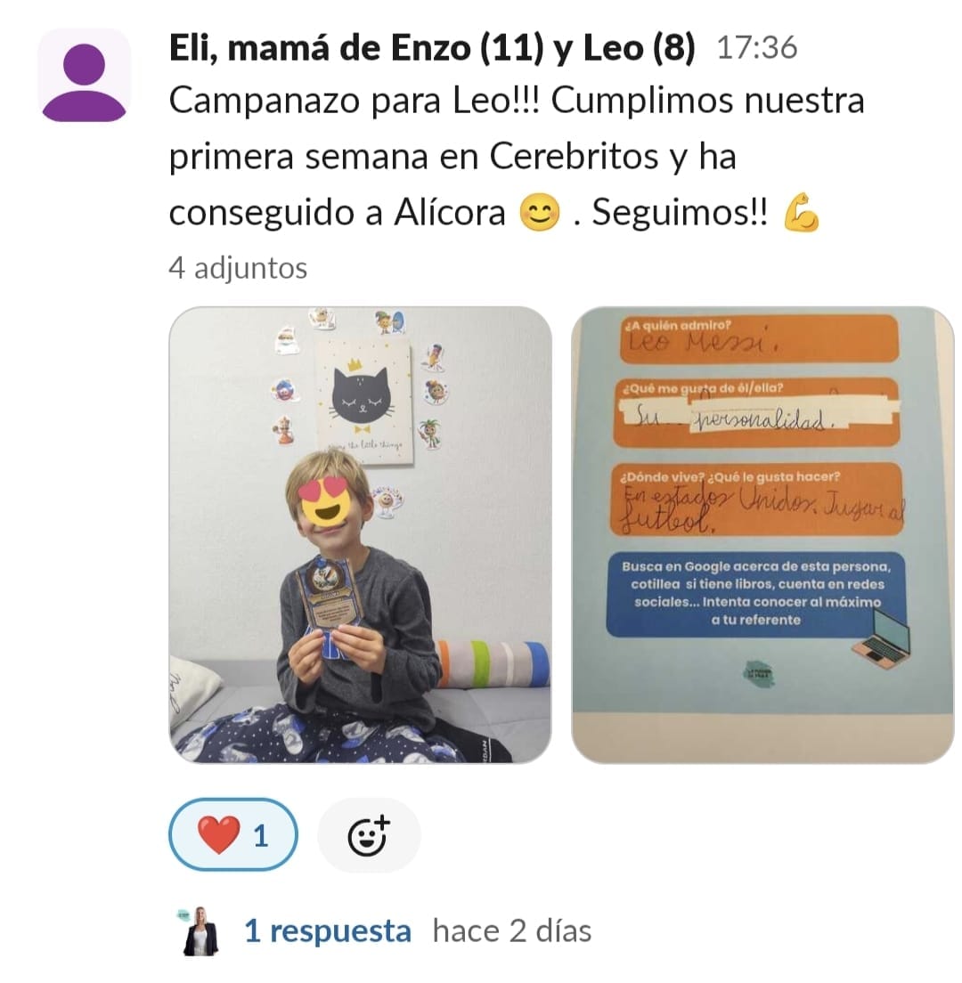 Al inicio me sentía muy preocupada de ver que Lucía iba cada vez peor en los estudios y perdida por no saber como poder ayudarla. Siempre se tienen dudas, había tanteado varias cuentas en instagram y no me acababan de convencer, primero descubrí a Paula, un día haciendo scroll apareció un vídeo suyo motivando a los peques a ver los errores como aprendizajes, bichee un poco su cuenta y descubrí que existía Cerebritos, justo lo que necesitábamos.