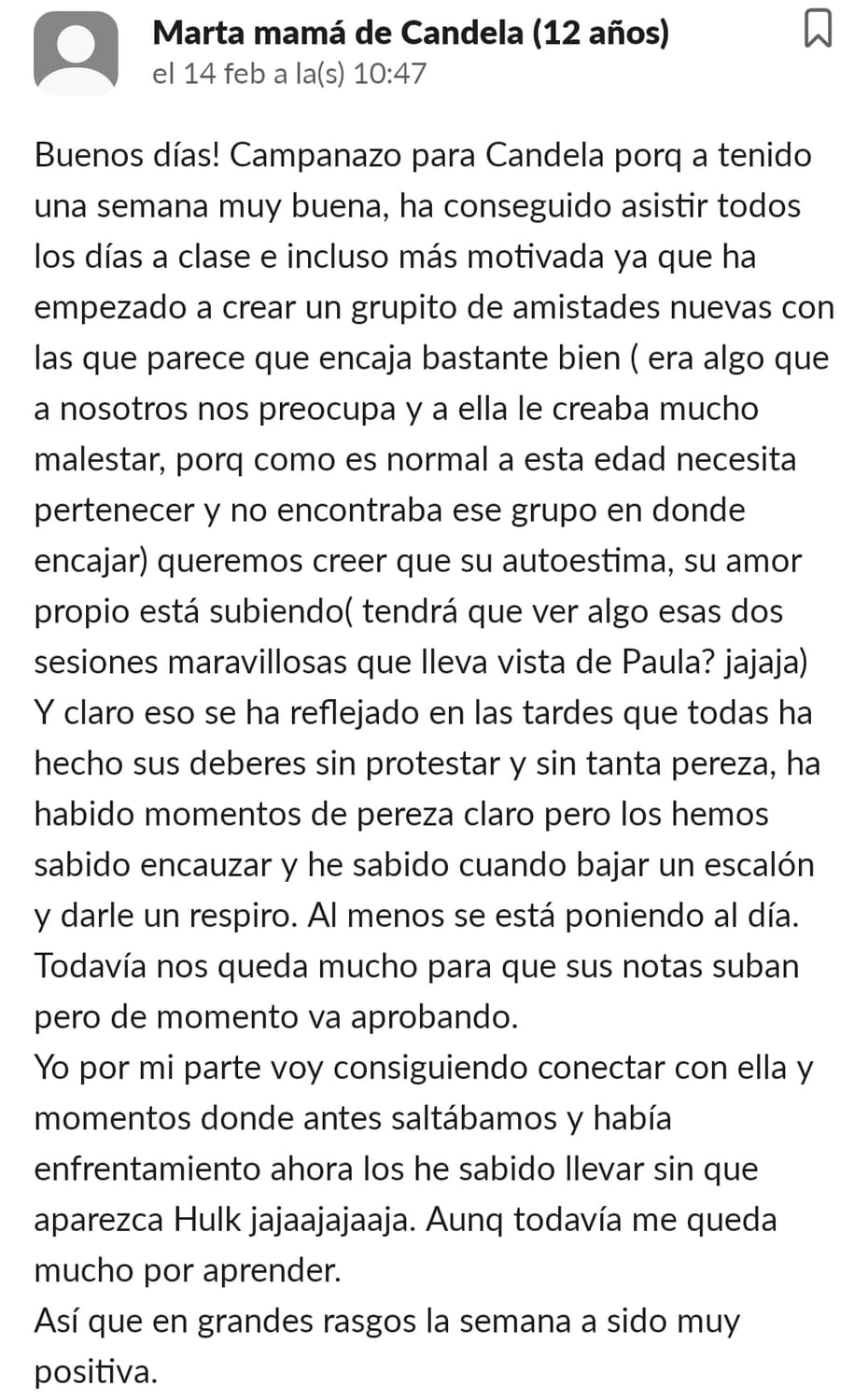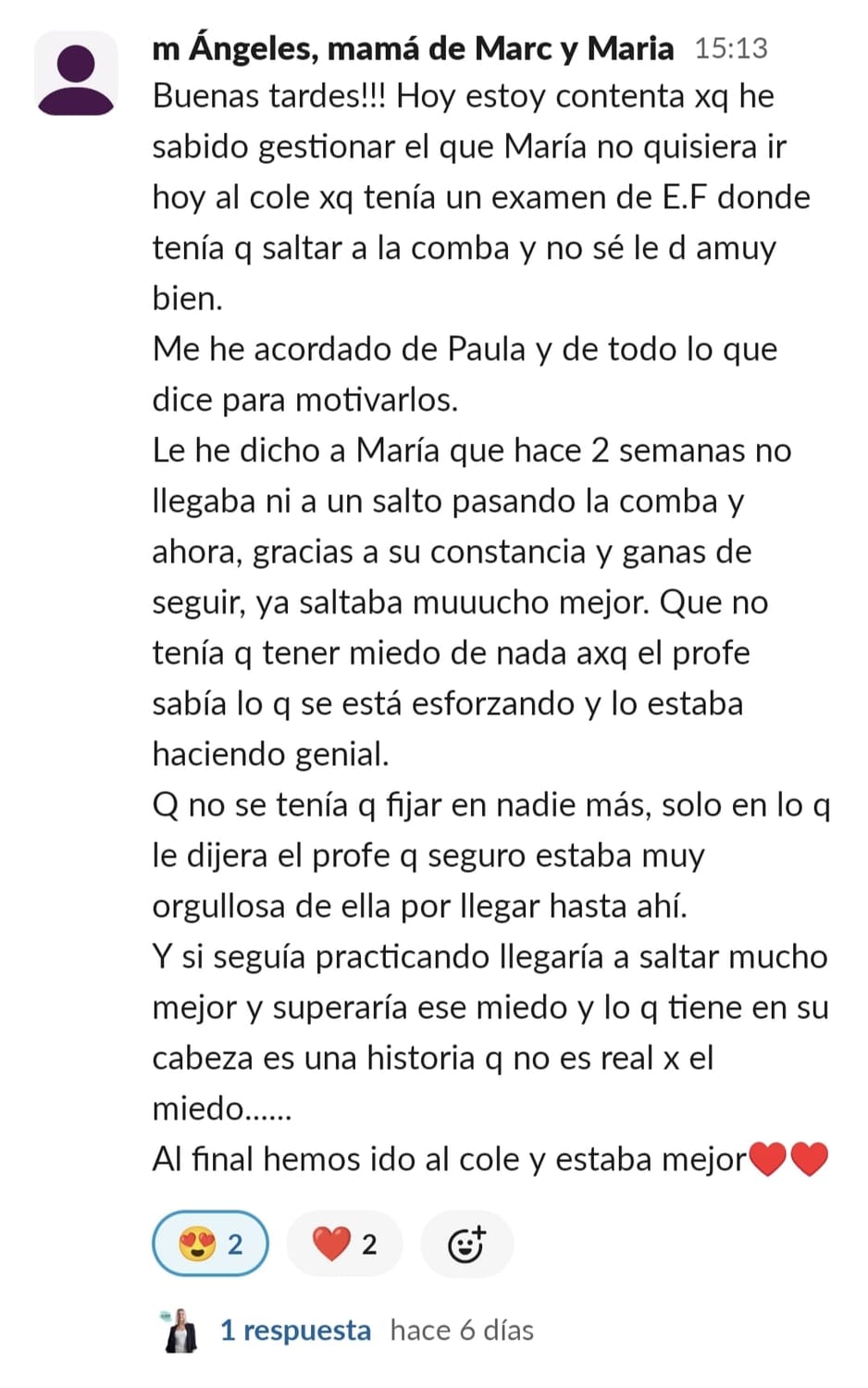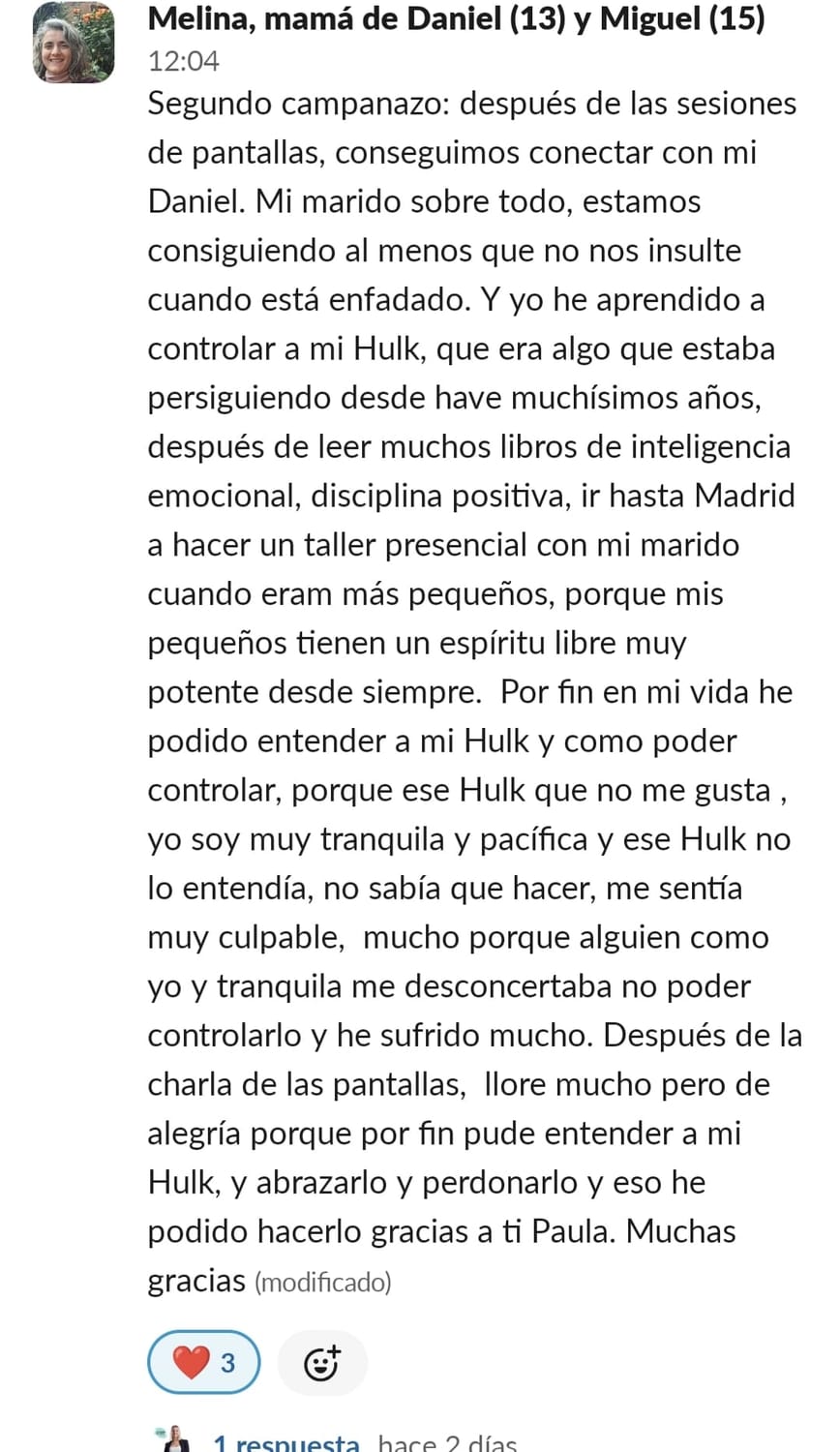 Estaba desesperada con mi hijo. Hasta este curso siempre le había ayudado a hacer los deberes. Nunca había sido buen estudiante, pero, había ido aprobando.Pero este curso no hacíamos más que discutir. Y si la profesora le mandaba algo y no lo hacía me echaba la culpa a mí, por no haberle recordado hacerlo.Antes de entrar pensé que esto sería un sacacuartos que no serviría para nada, pero necesitaba probar algo, y hacía tiempo veía cosas de la pizarra de Paula en internet y me daba confianza. Cuando entramos, mi hijo no quería trabajar, y cuando hablé con Paula y me dió pautas directamente hablando con ella, me quedé de piedra, estaba hablándome directamente a mí. Pensé, necesitaba una Paula en mi vida, que me ayudara a ir solucionando cuando hay un problema. Hemos conseguido grandes logros. Primero con el niño que ha conseguido sacar unas buenas notas de 8 para arriba en sociales y naturales, ¡si no le gustaban! Segundo la organización y la rutina, aunque me cuesta mucho, porque es muy desordenado, y muy desobediente, pero cuando le digo que se lo digo a Paula espabila que no veas. Y en tercero y el más importante, como me hace sentir Paula, se deja la piel con nosotras, tenemos reuniones todas las semanas , en las cuales nos da claves para problemas que tenemos con los niños, y lo mejor es como nos hace sentir a nosotras, nos empodera con sus palabras y nos hace sentir unas super mamás. Gracias por estar ahí y ayudarnos. A las mamás que aún se lo están pensando les diría que qué no entren, si lo que quieren es seguir peleándose con sus hijos. Pero si lo que quieren es sentirse más tranquilas, e incluso llevarse mejor con sus hijos, y sin voces , os lo recomiendo, todo el mundo tendría que tener alguien así en su vida
