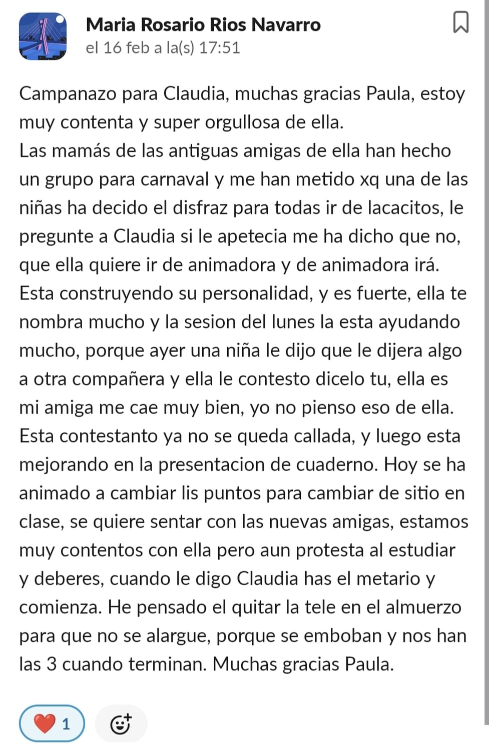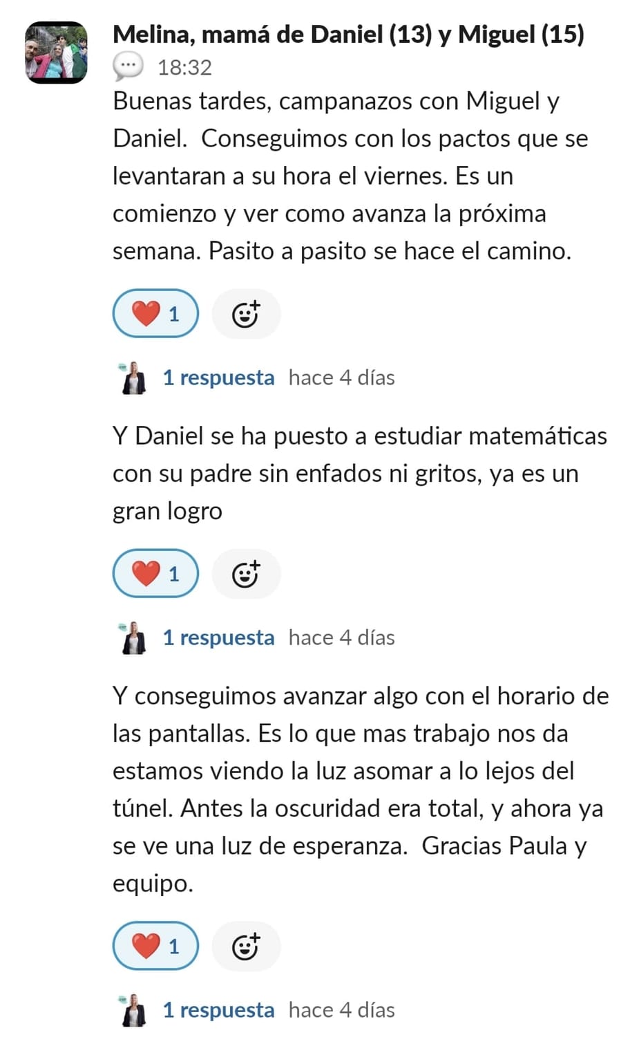 Cuando empezamos con el programa estaba desorientada y sentía mucha impotencia al ver que no podía ayudar a mi hijo de ninguna manera, no sabía qué hacer. Cuando entramos al programa se nos abrió un mundo nuevo y con esperanza. Y aunque llevamos poco tiempo en el programa, su conducta y su comportamiento es más alegre, está enfocado en hacer los deberes y escuchar a Paula.
