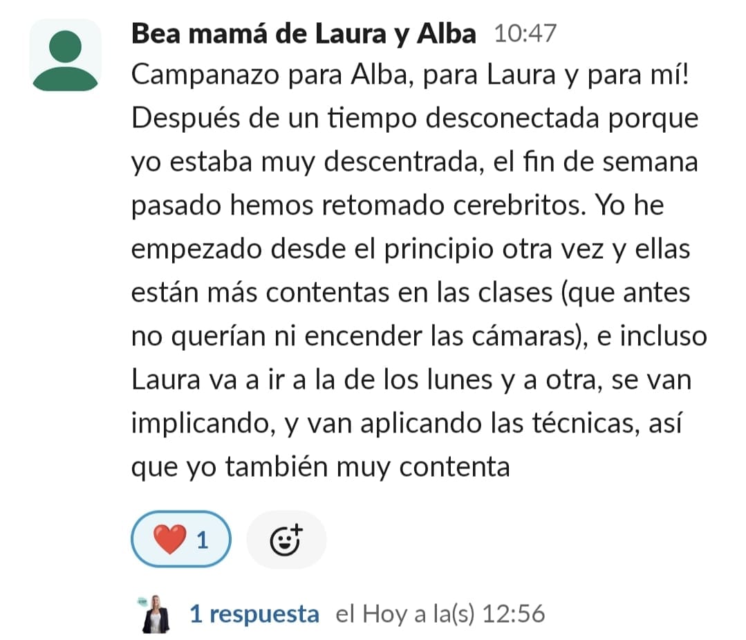 Cerebritos me ha dado mucho más de lo que esperaba, entre muy preocupada pero con mucha ilusión y no me ha defraudado, ahora voy más segura sabiendo que tengo herramientas y conocimientos para poder ayudar a mi hija.
